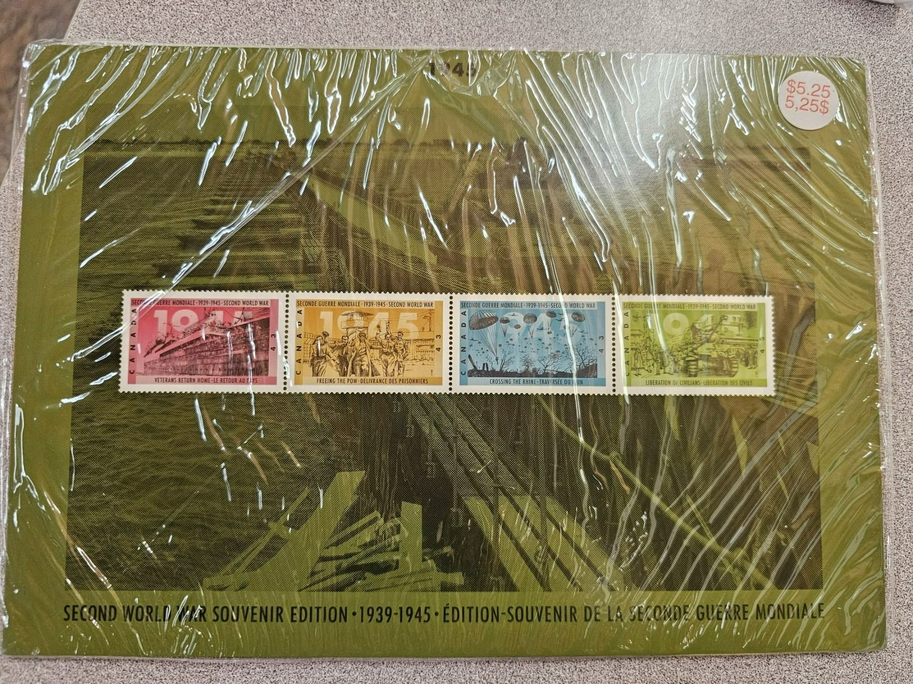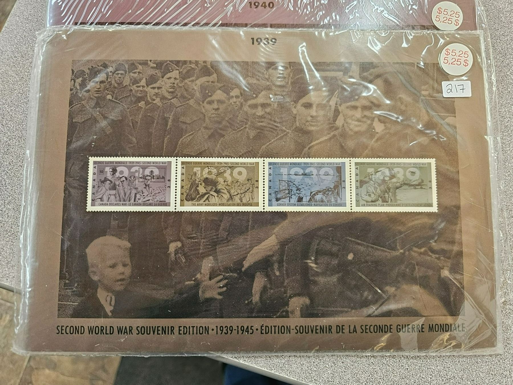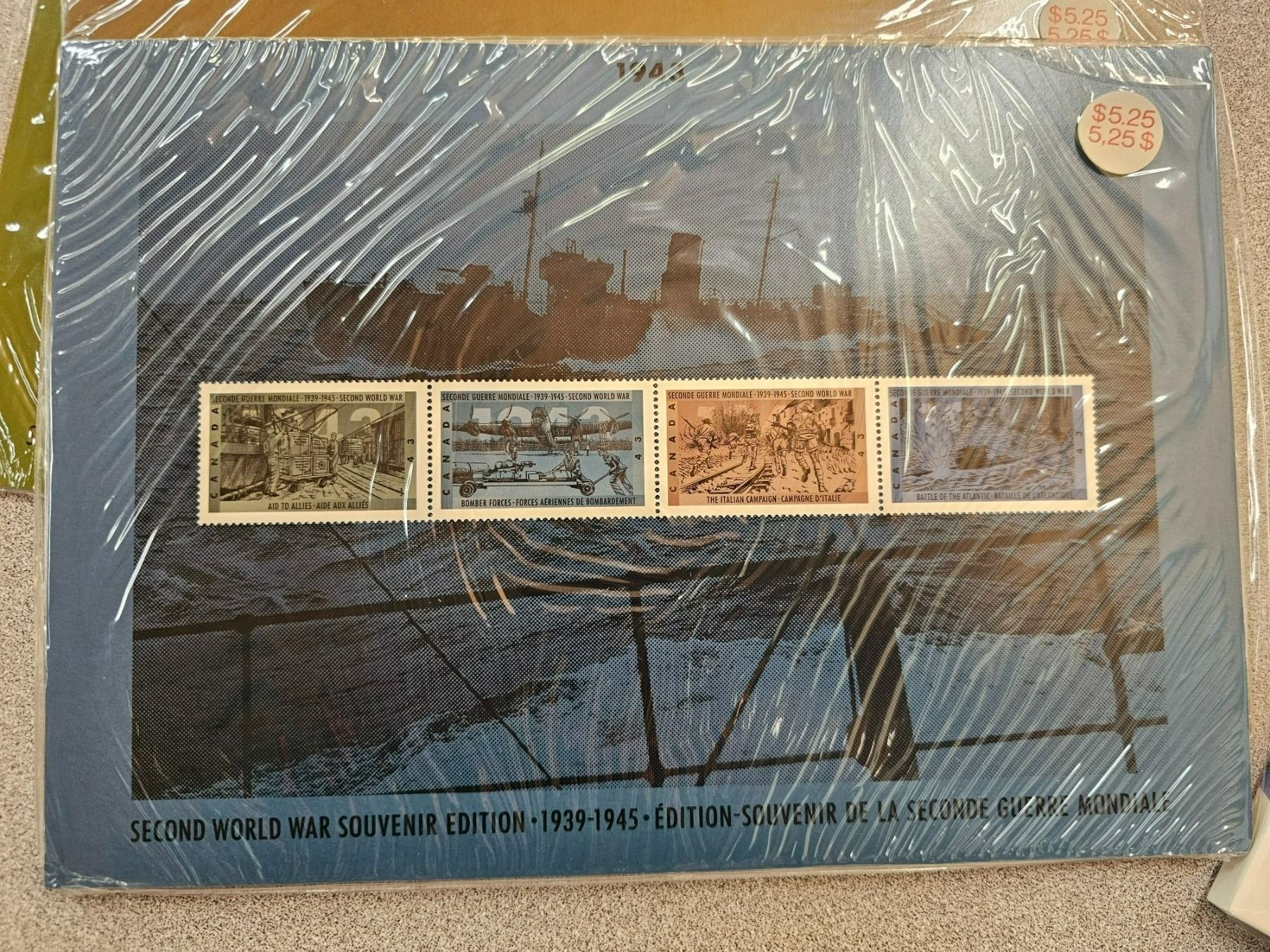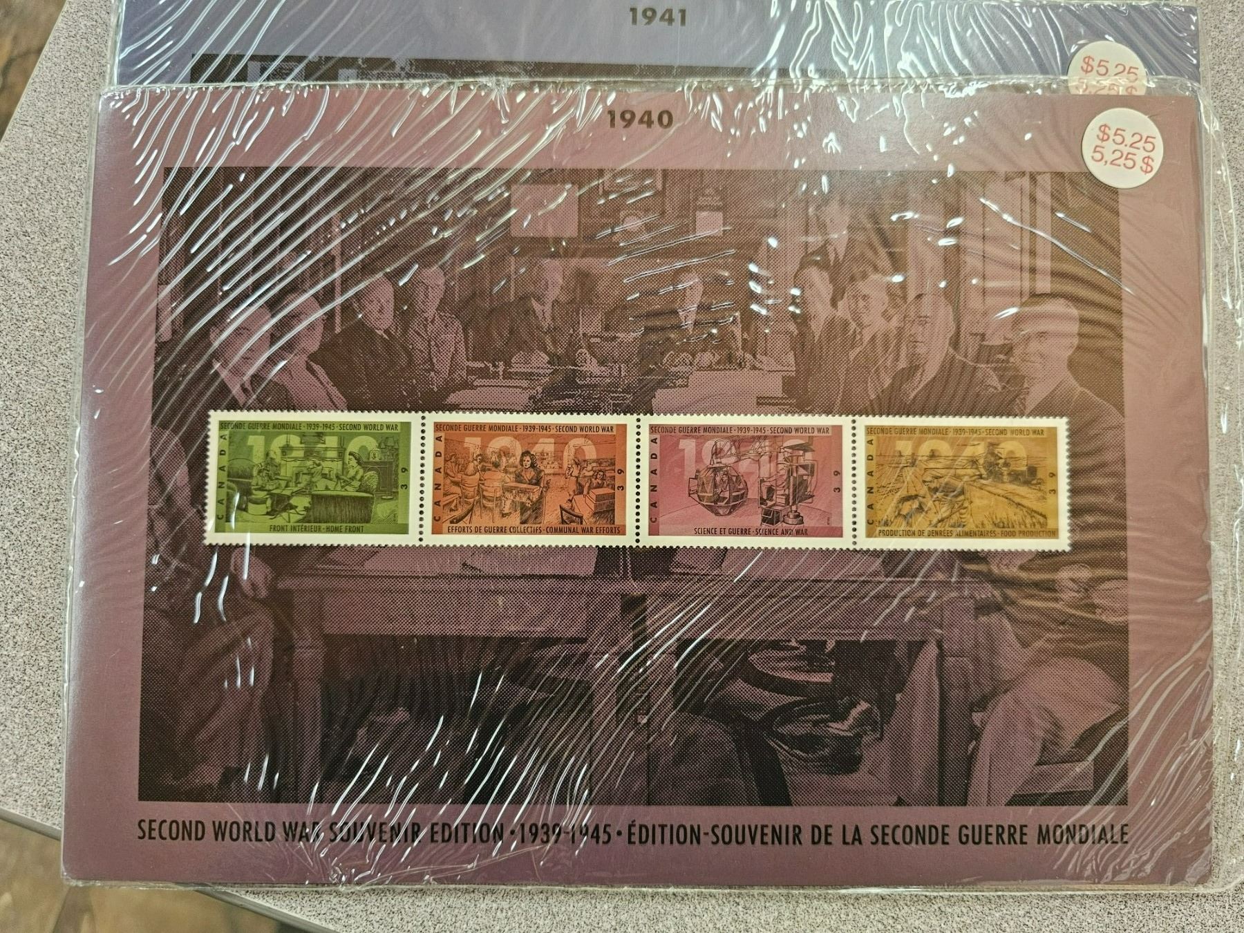 7 complete sets of Canadian Stamps to commemorate Canada during World War II. 1939, 1940, 1941, 1942, 1943, 1944, & 1945. All Second World War Souvenir Edition stamps. As issued by Canada Post. All 7 sets are unopened & Mint.