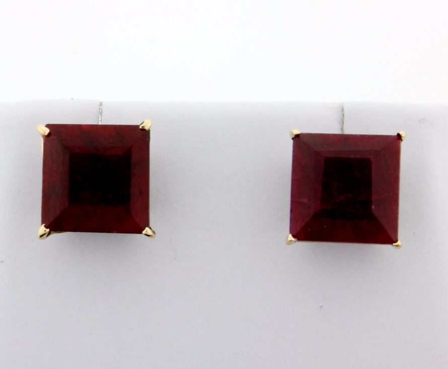In 14K yellow gold, they contains 9mm square rubies with beautiful colors. They have 14K friction backs. 2.2g