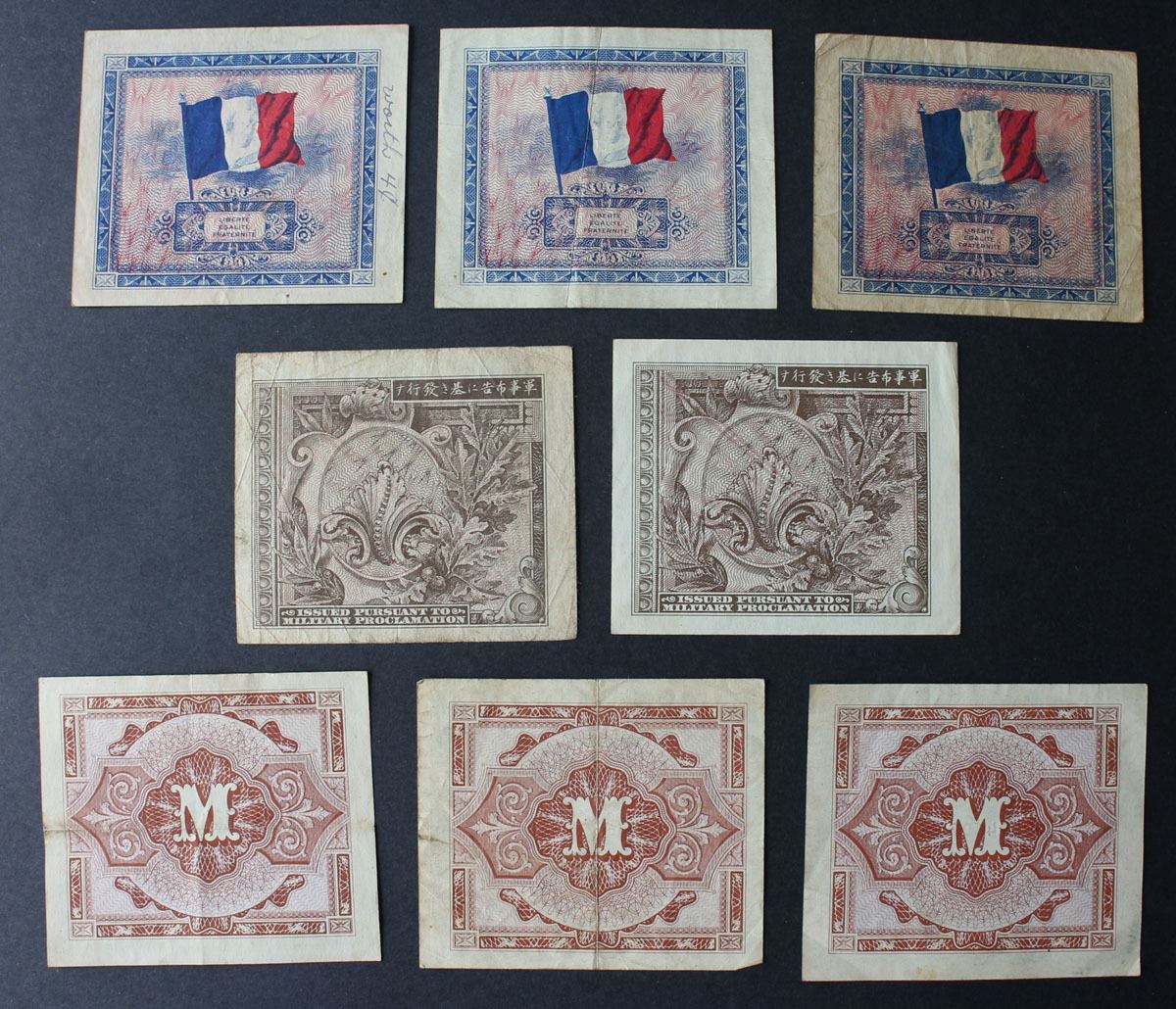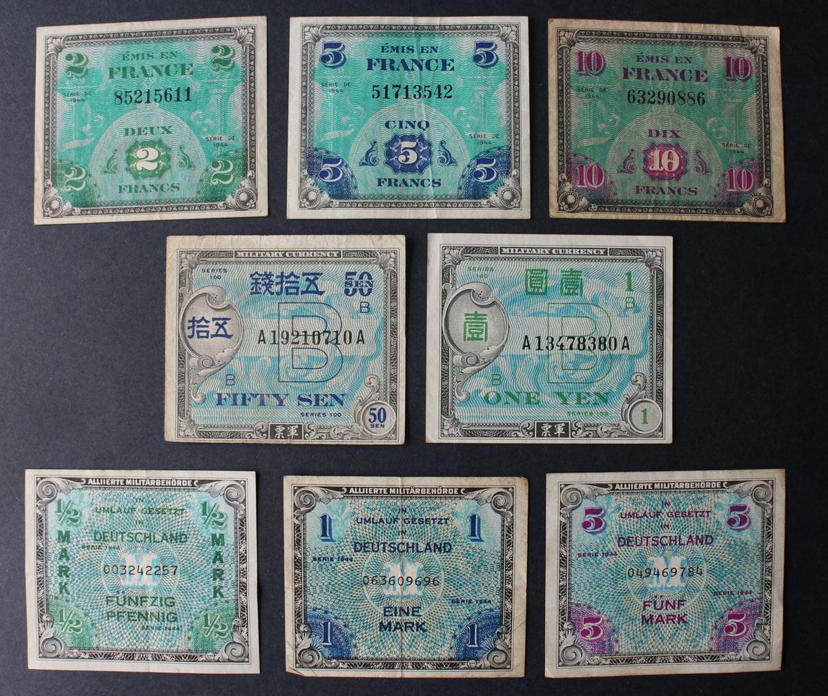 A lot of 7 Different Allied Currency Notes from WWII, Includes Japan, France & Germany Fine-XF. Lot should be viewed. No Returns