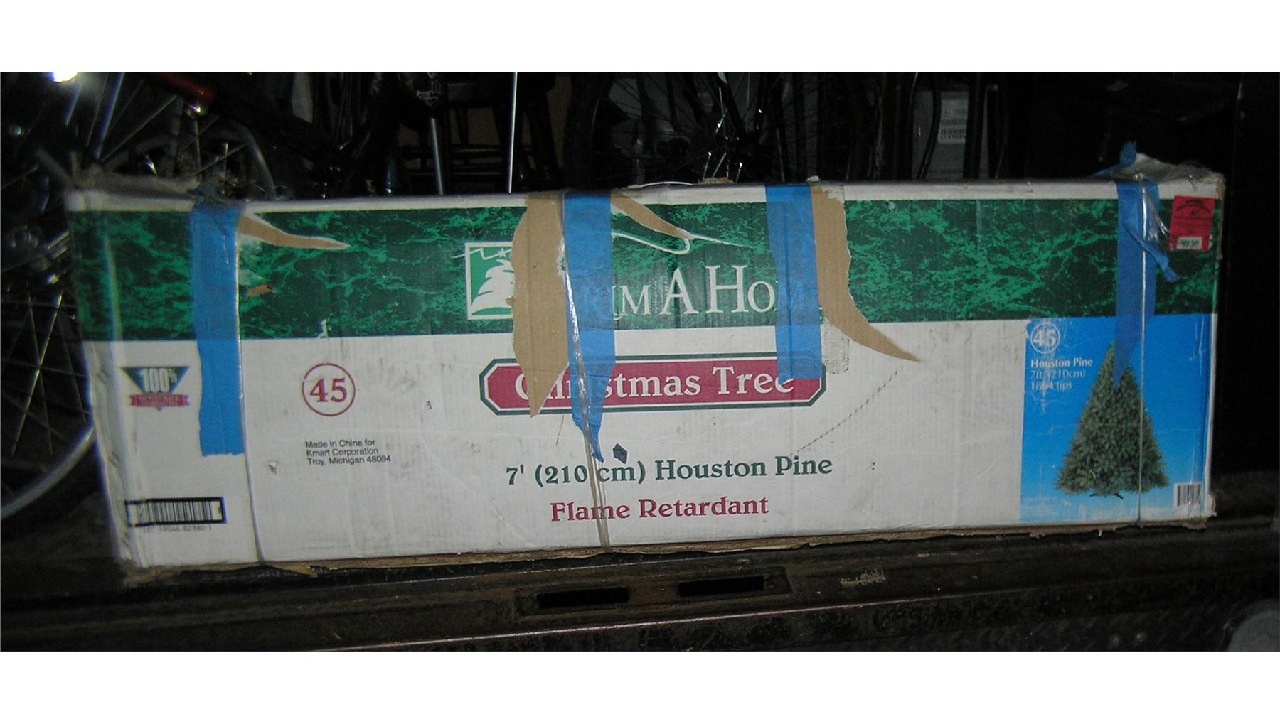 7 foot Houston pine flame retardant Christmas tree with original box est. value $100.00-$125.00