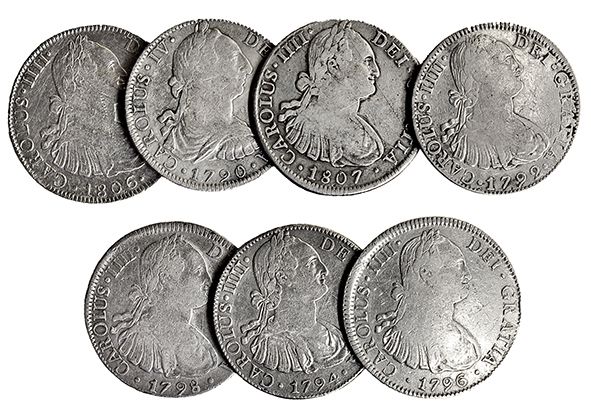 7 monedas de 8 reales. México. 1790, 1792, 1794, 1795, 1798, 1806 y 1807. MBC-/MBC.