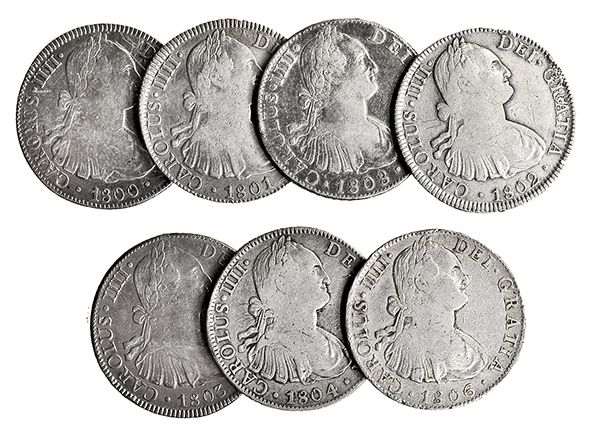 7 monedas de 8 reales diferentes. México. 1800, 1801, 1802, 1803, 1804, 1806 y 1808. BC+/MBC.