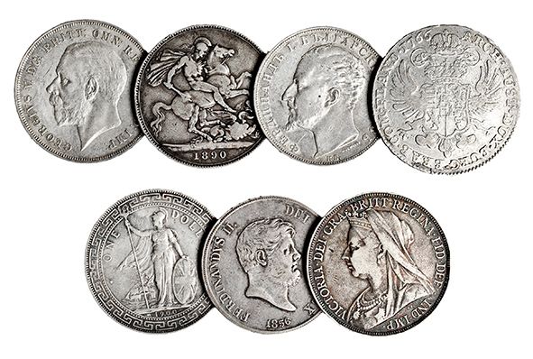 7 monedas módulo duro. Austria: taler, 1766. Gran Bretaña (3): corona, 1890, 95 y 1935; dólar, 1900. Nápoles: piastra de 120 granos, 1856. Bulgaria: 5 leva, 1894. MBC-/MBC+.