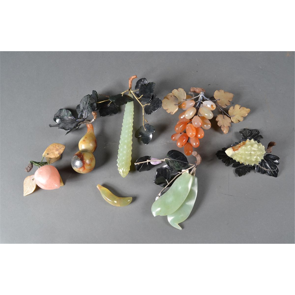 To include a double gourd, two peapods, a bunch of grapes, possibly a passion fruit, a bean pod, possibly a cucumber and a quartz peach. All with jade or hardstone foliage attached to each piece with the exception of the bean pod. Largest 5.5" L. Circa early 20th century. Private collection Ada, MI.