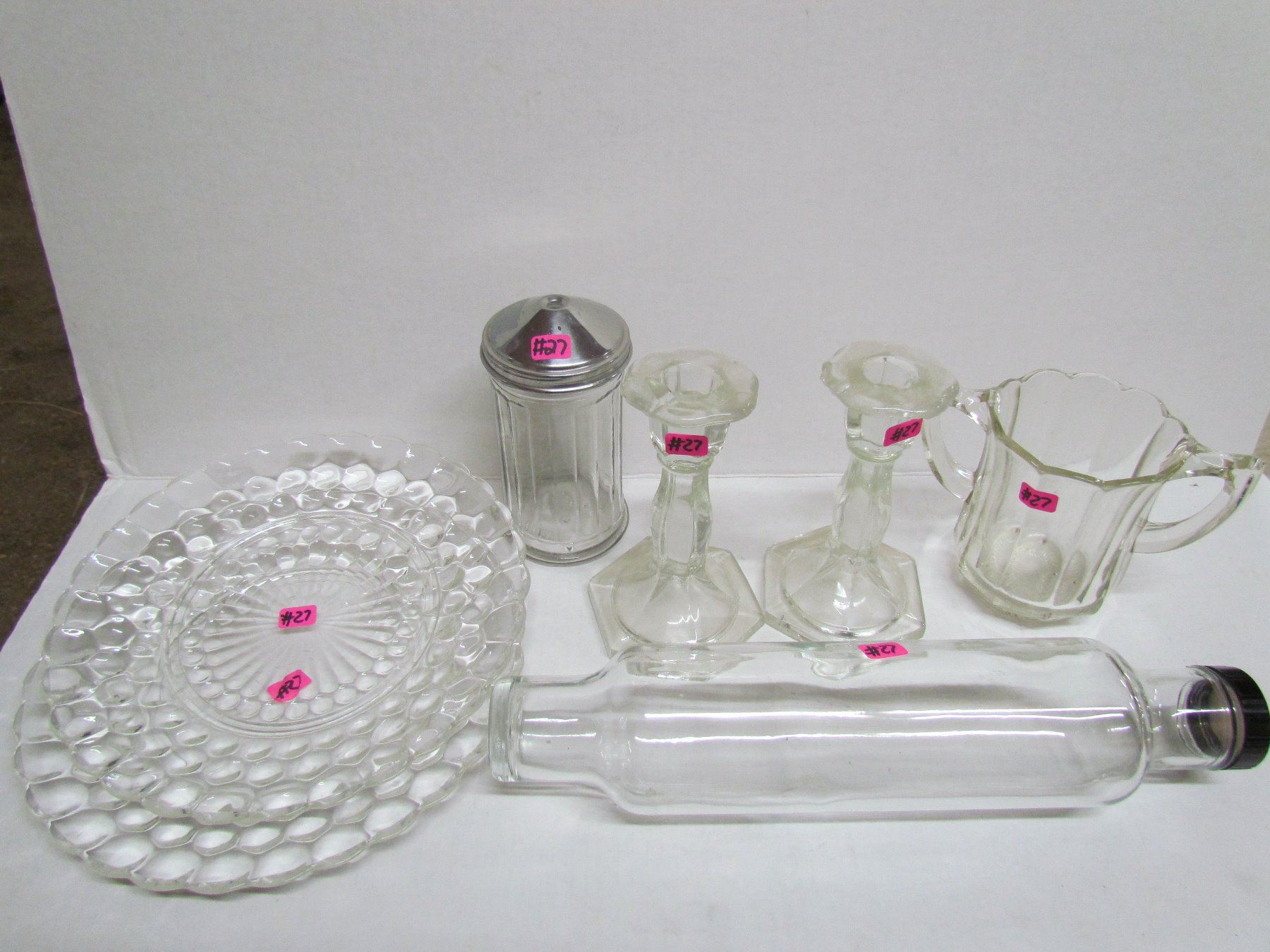 7 pieces of Glassware (Spooner, Sugar, plates, candle sticks)