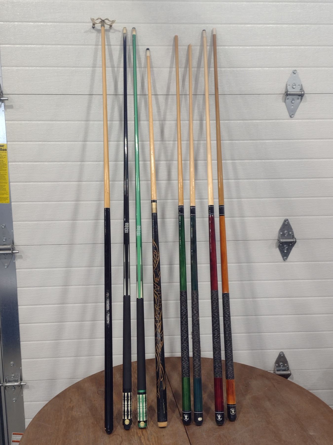 2 aluminum cues set, 4 wood cues set and a single wooden travel cue.