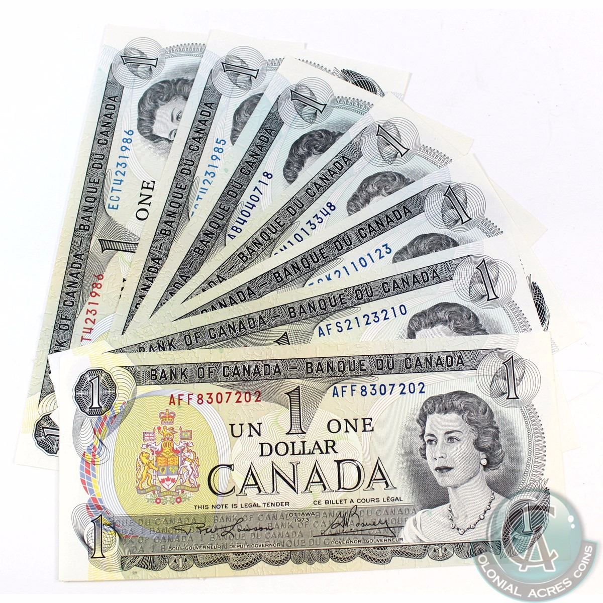 7 x 1973 $1 Notes in UNC Condition including a Scarce Prefix AFF. 7 pcs