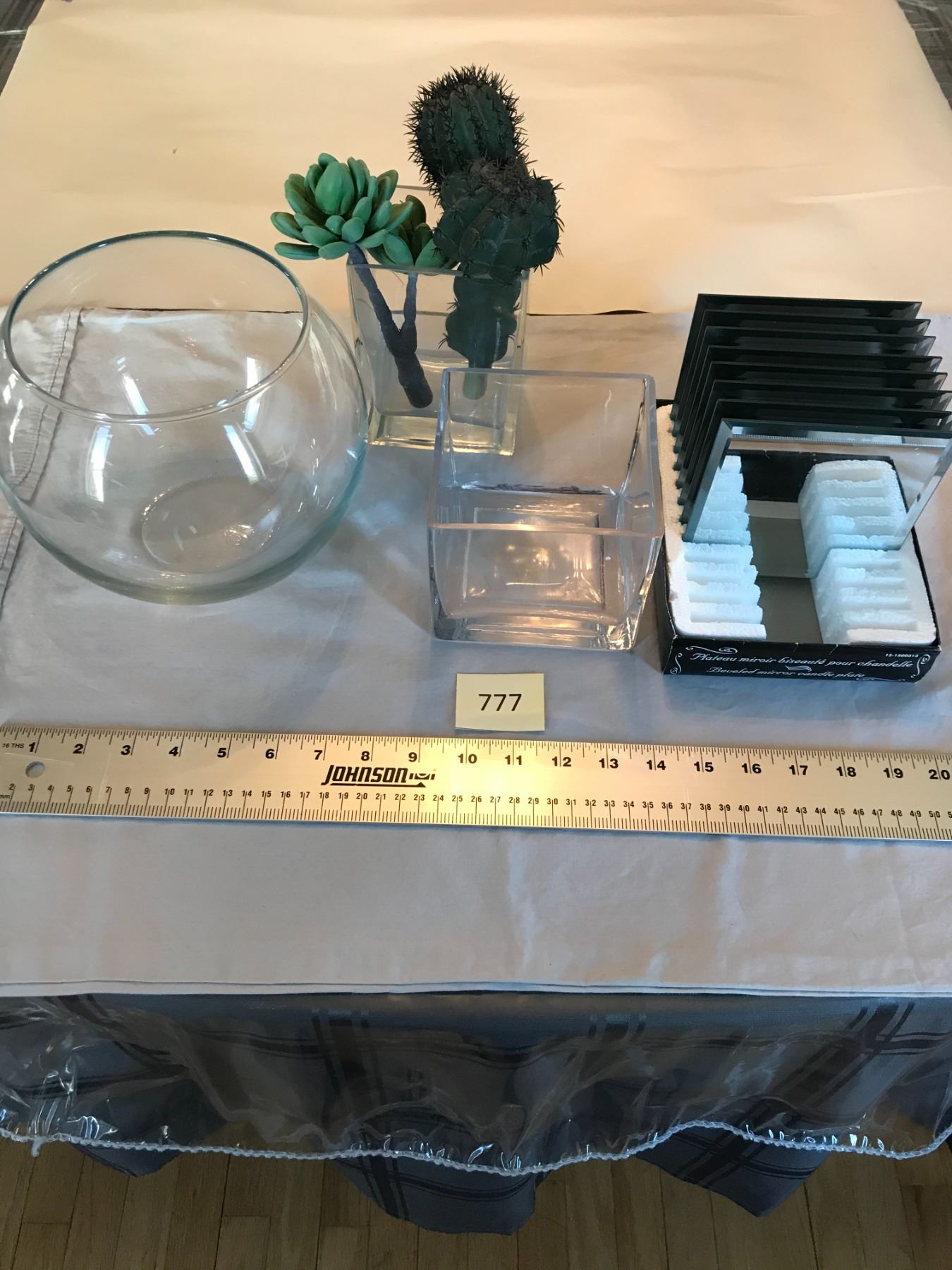 7 x Beveled Mirror Glass Plates; 3 x Glass Vases; 3 x Plastic Cactus