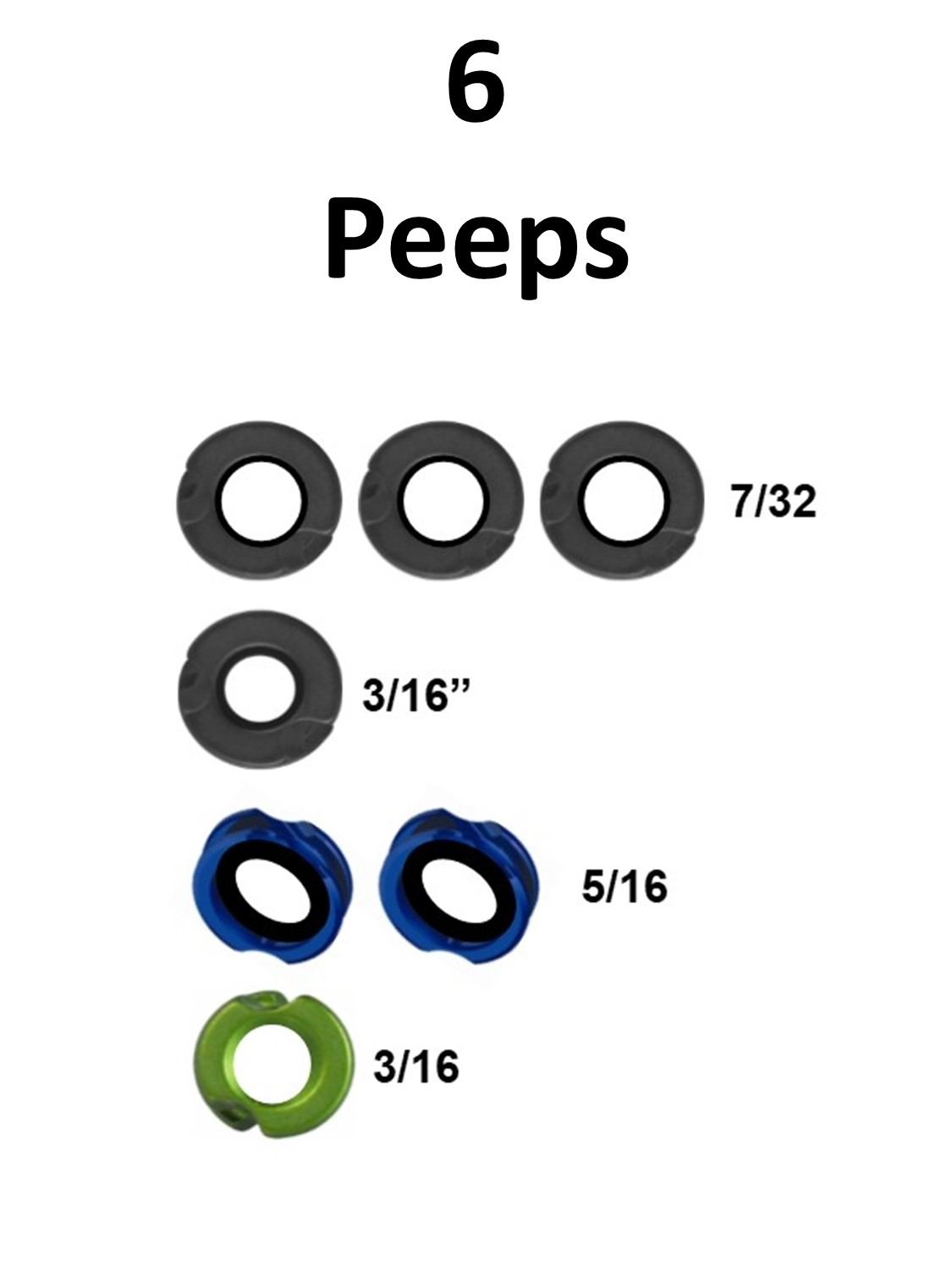 7 x Peeps, 4 x Clearshot Speed Peeps, 3-7/32 Black, 1-3/16 Black, 3 x G5 Meta Peeps, 2-Magnum Hunter 5/16, 1-Green 3/16