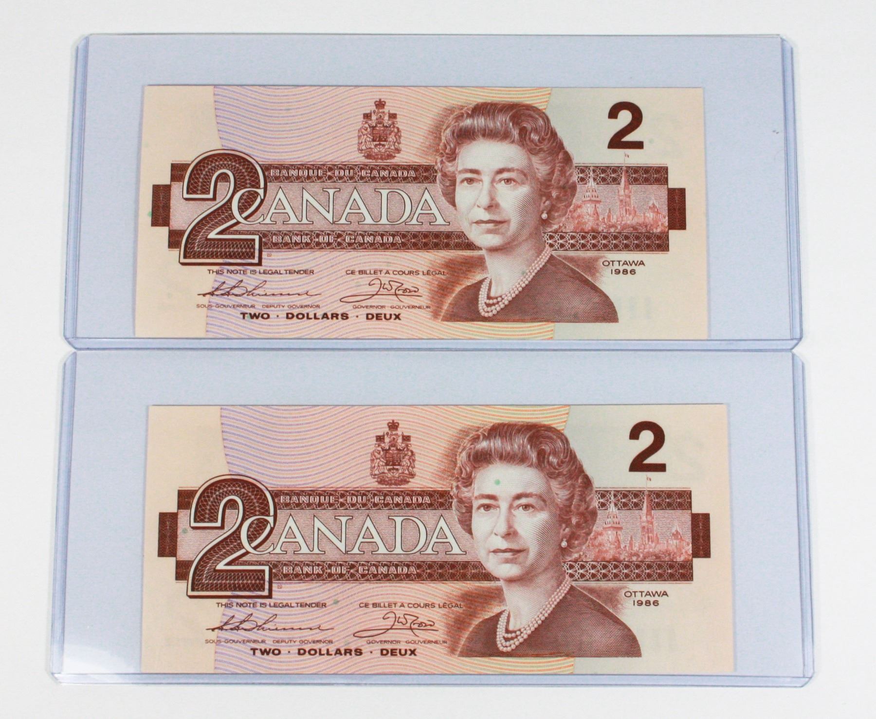 QUEEN ELIZABETH II QEII CANADIAN CANADA PAPER MONEY NOTE LOT OF 2 1986