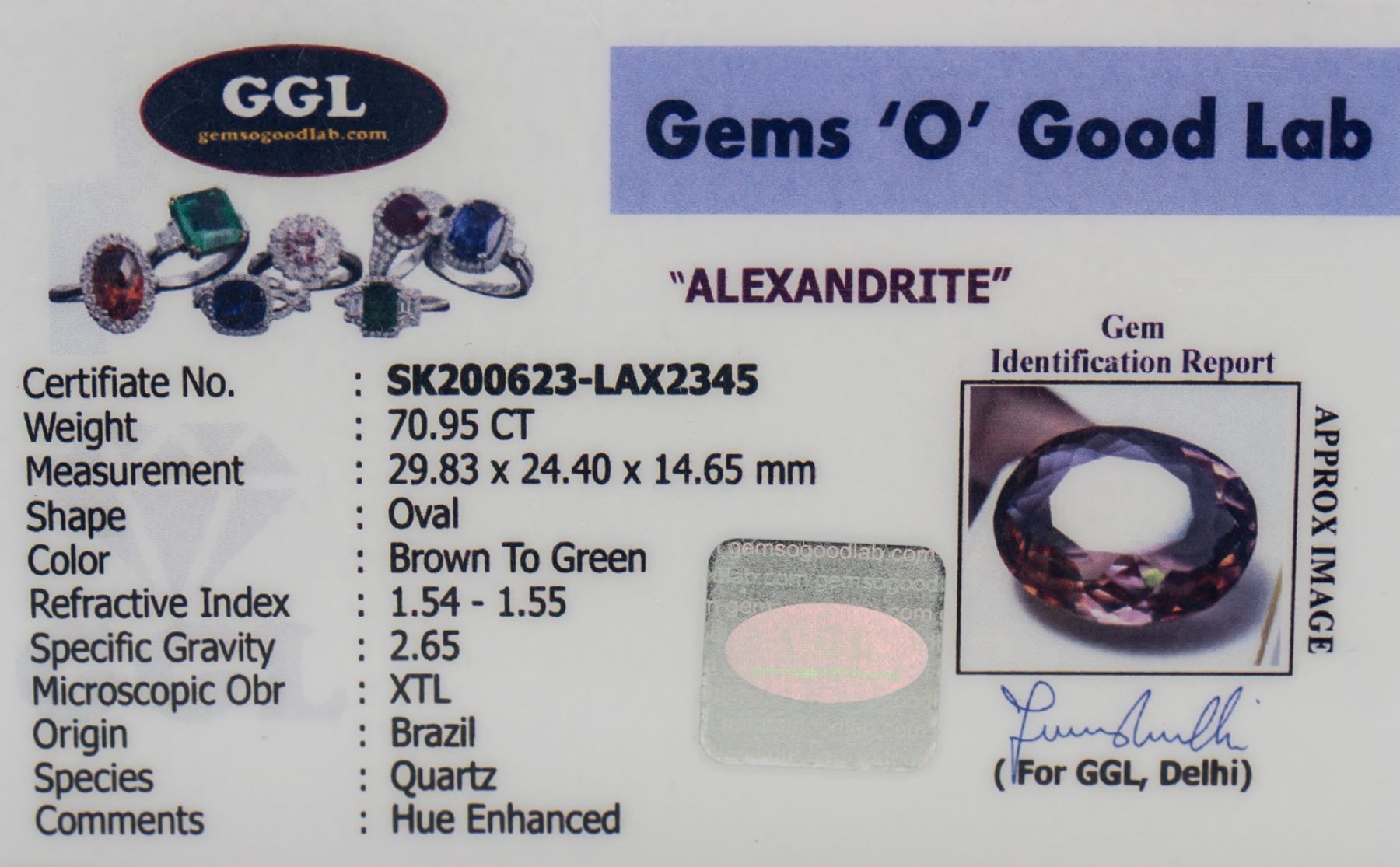 One (1) 70.95 ct oval cut brown to green alexandrite. Origin: Brazil. Accompanied with GGL certificate. 29.83 x 24.40 x 14.65 mm.