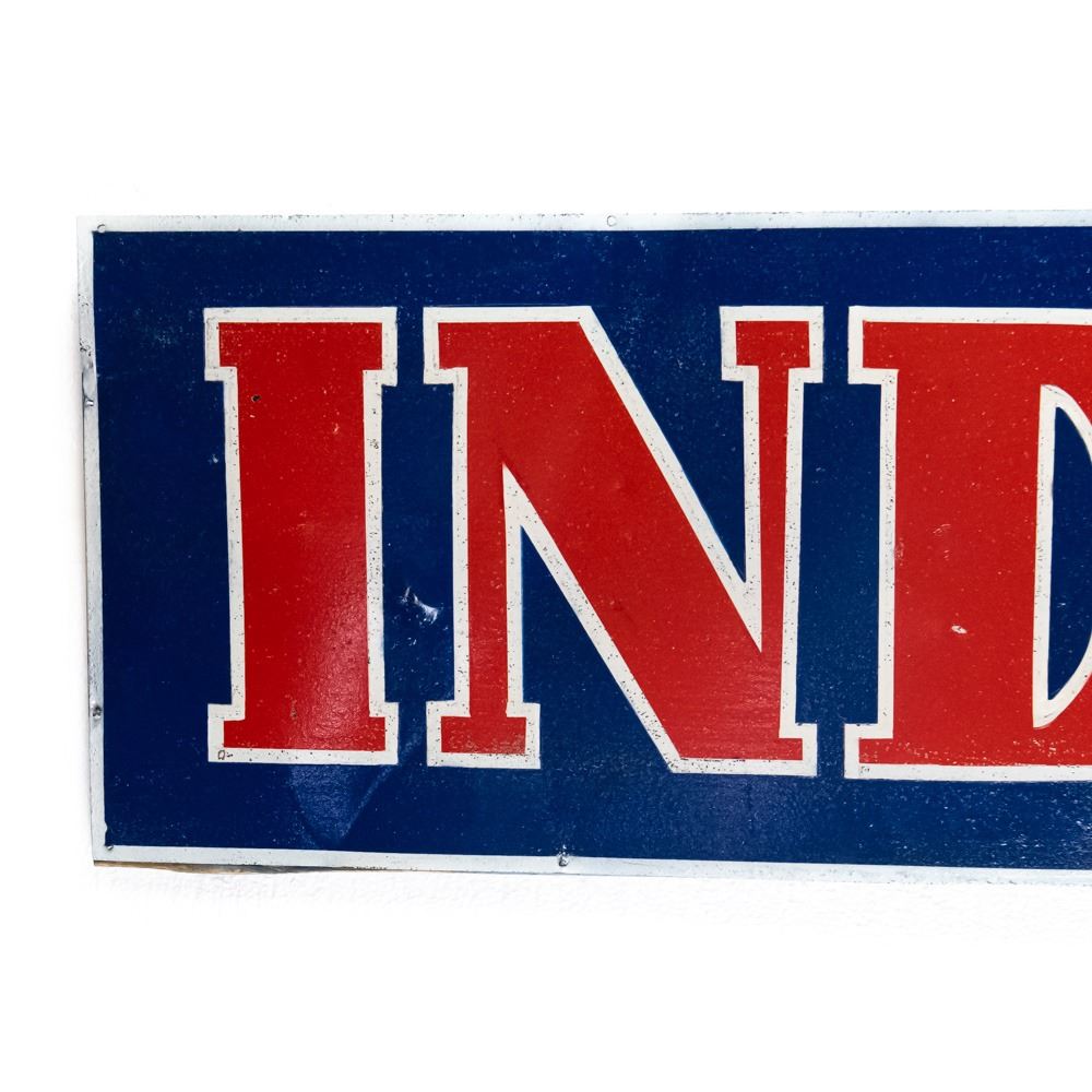 Vintage India Tires single sided tin advertising sign. Very good to good overall condition with minor discoloration, stray marks and paint loss. Presents well with attractive bold color & gloss. Approximately 10.5"t x 70"l; wood backed rear framing. Please use photos to judge condition and bid accordingly.
