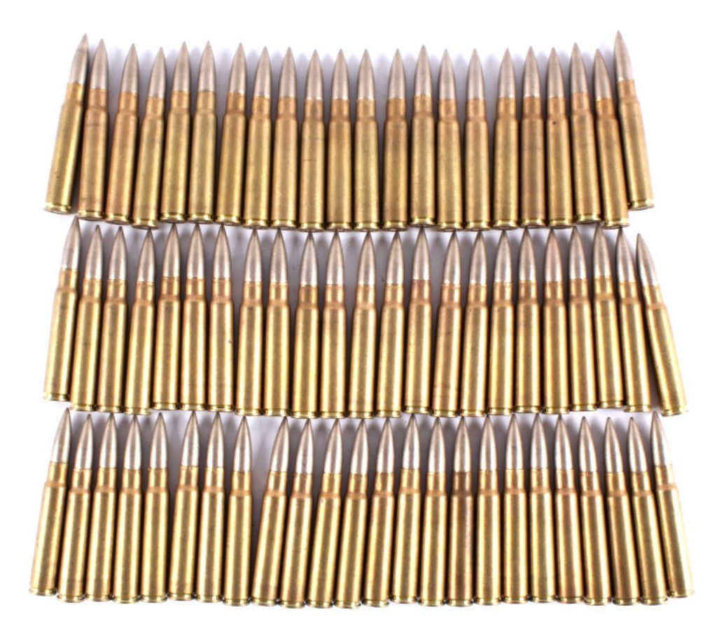 The lot features 70 unfired rounds of 8mm Mauser Turkish. These are all marked 1945 7.9 FS WWII. These are hard to find rounds.