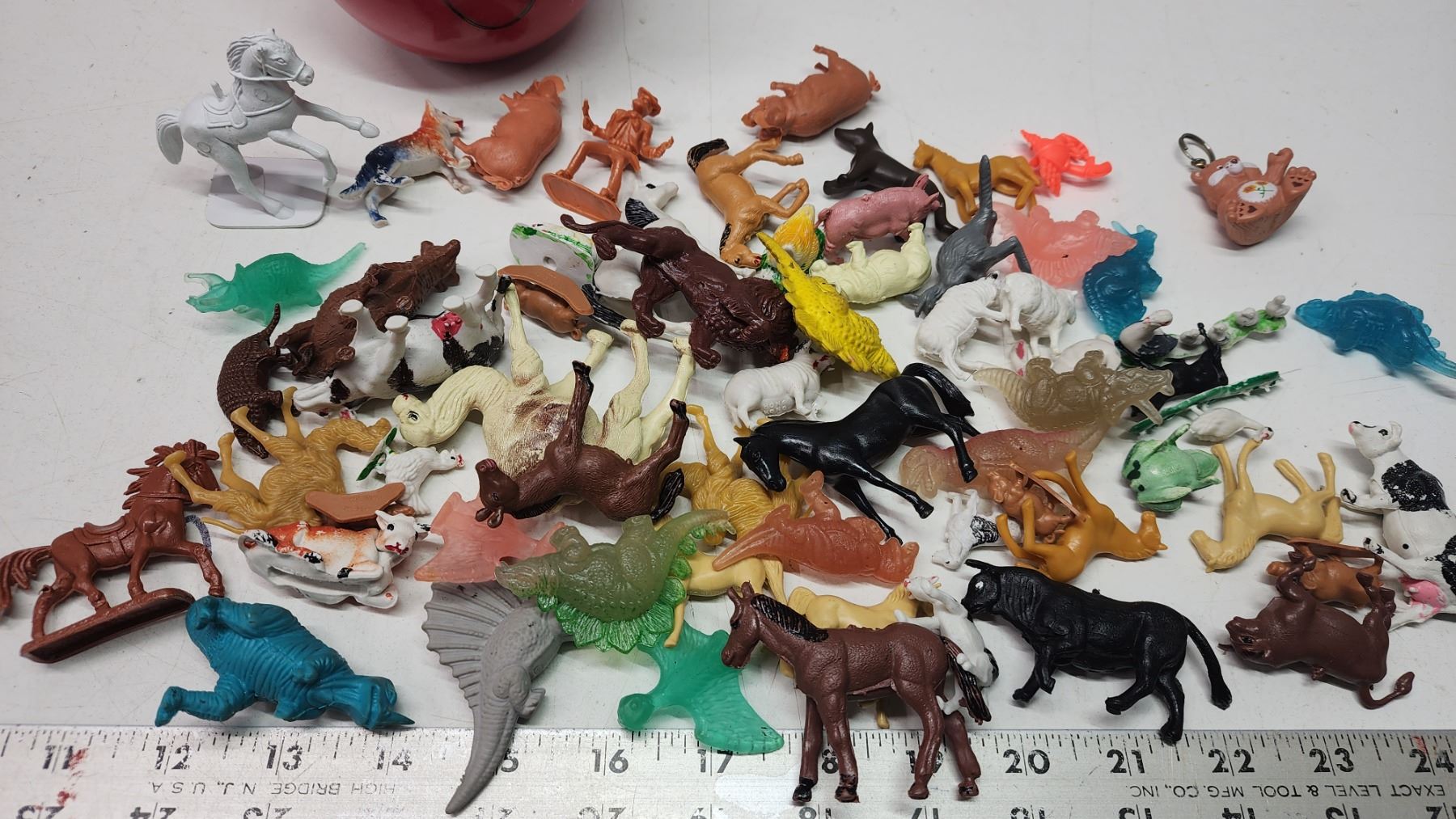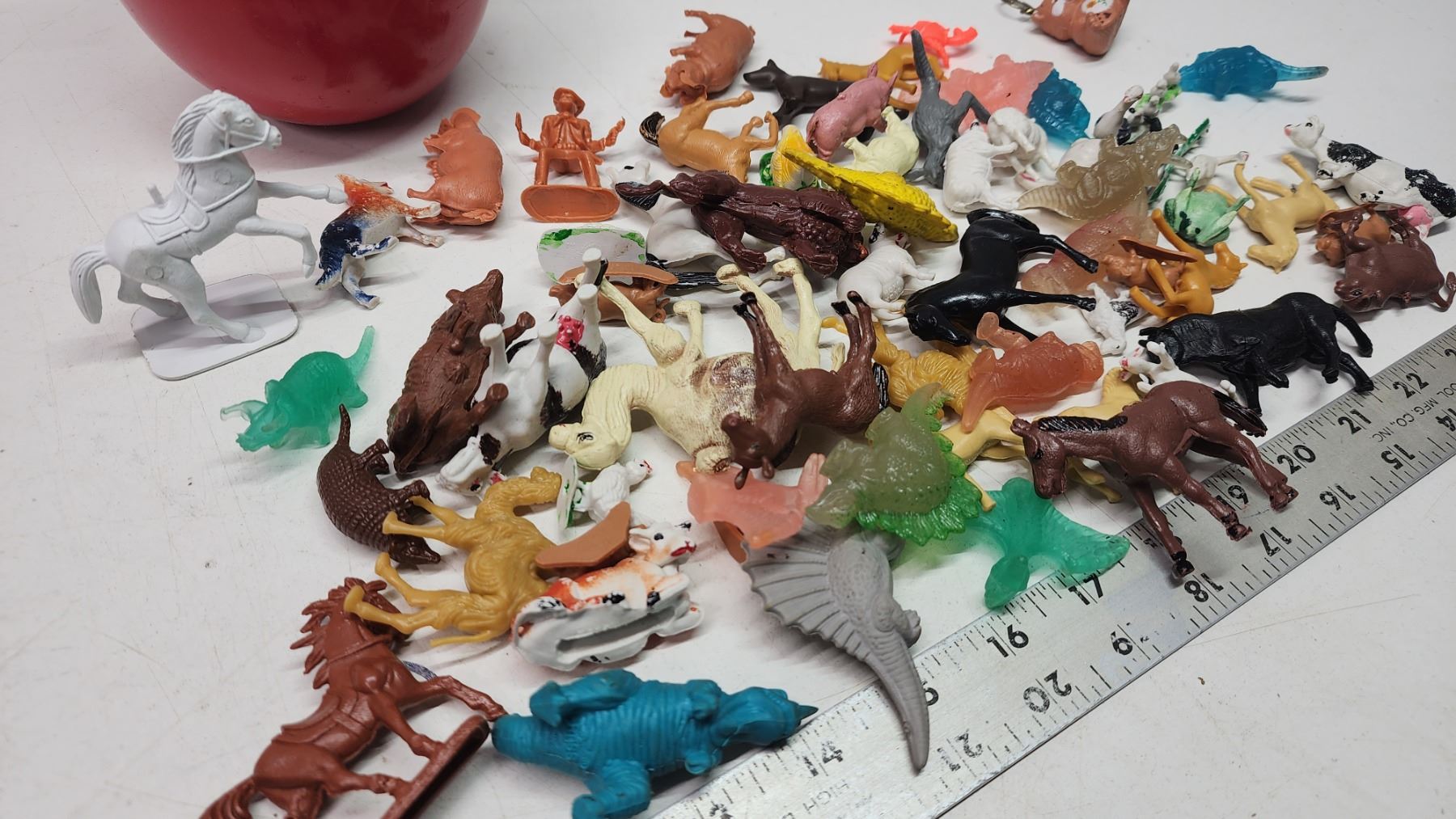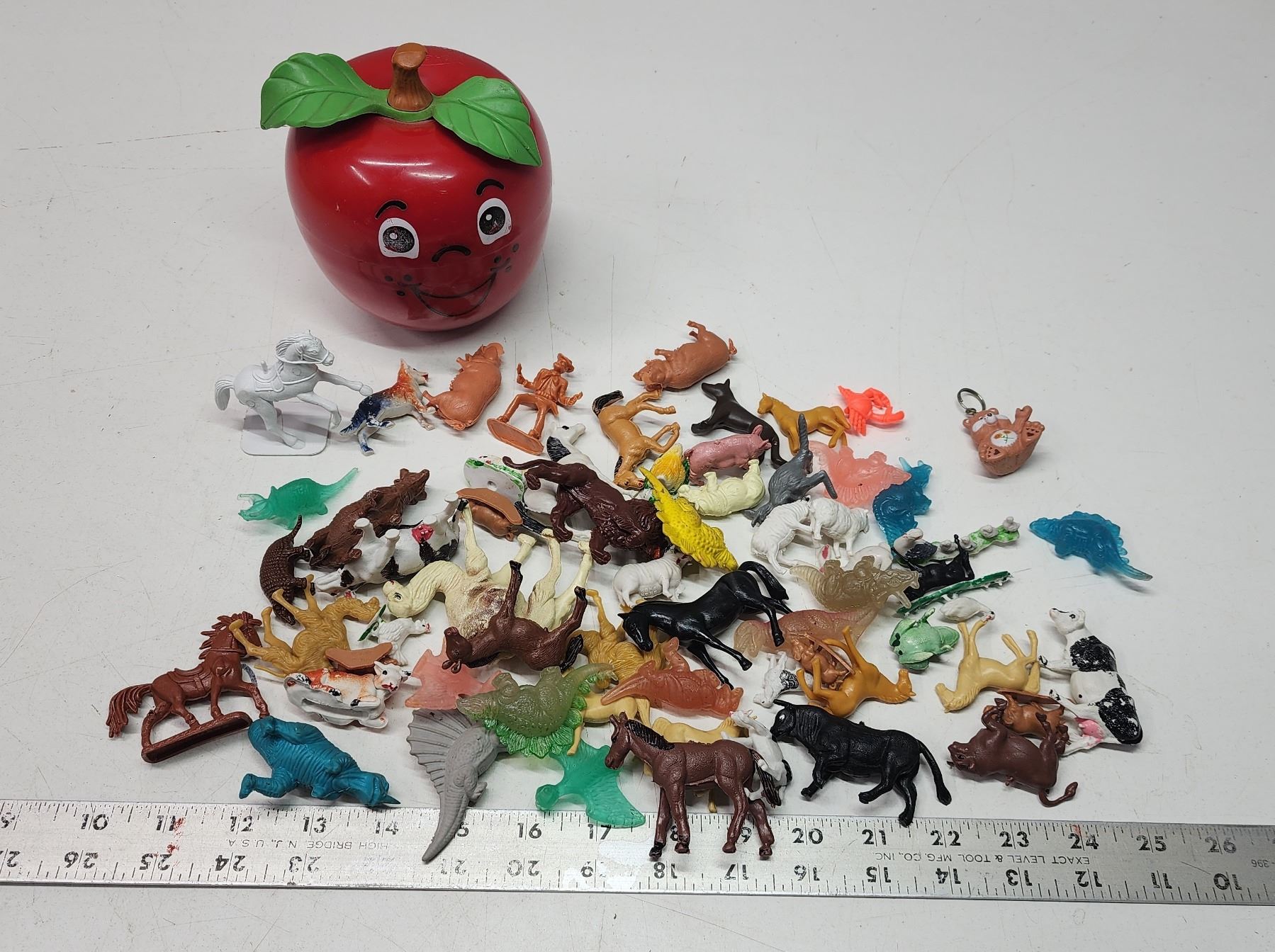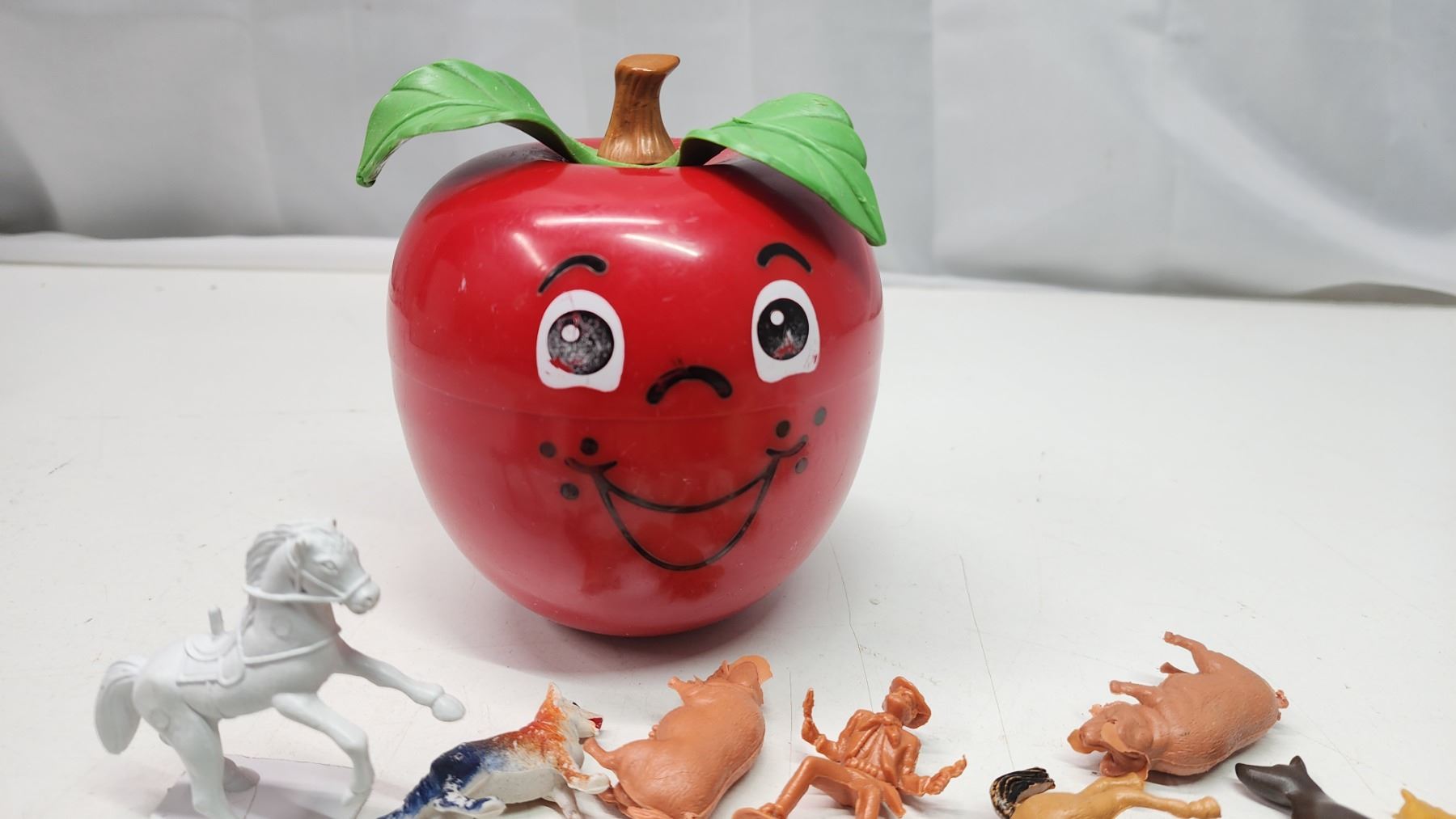 70’s Fisher Price Chiming Happy Apple and Pail of Toy Animals etc.