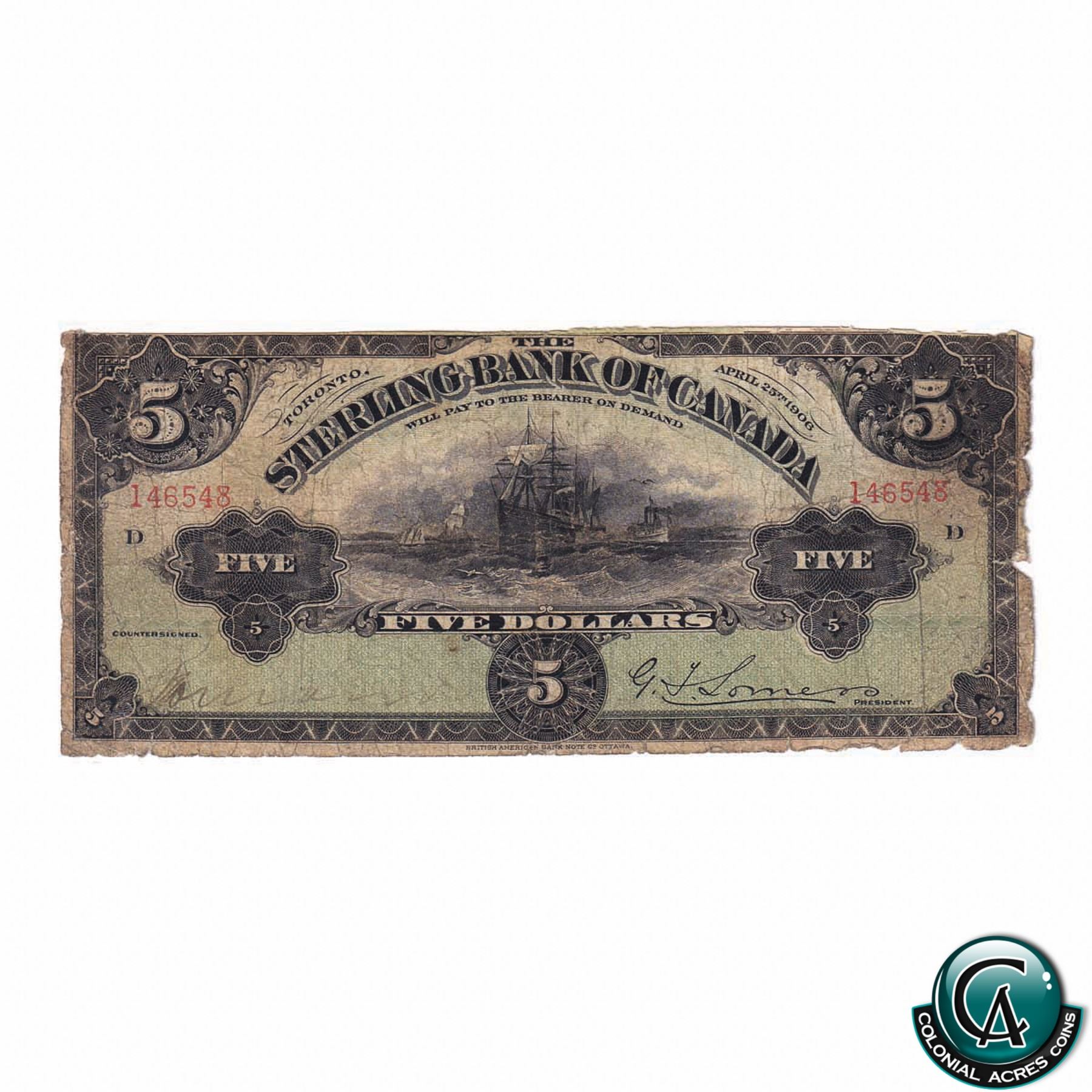 700-10-02. 1906 Sterling Bank of Canada $5, Various-Somers, S/N:146548 PMG F-12. Note has been trimmed and has some rough edges.