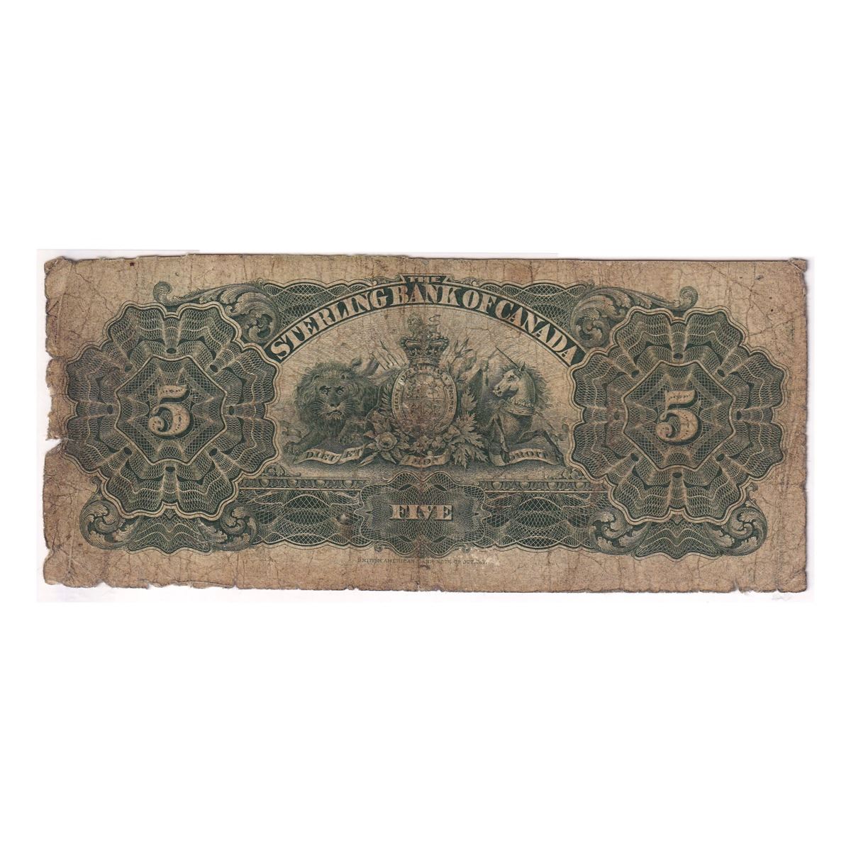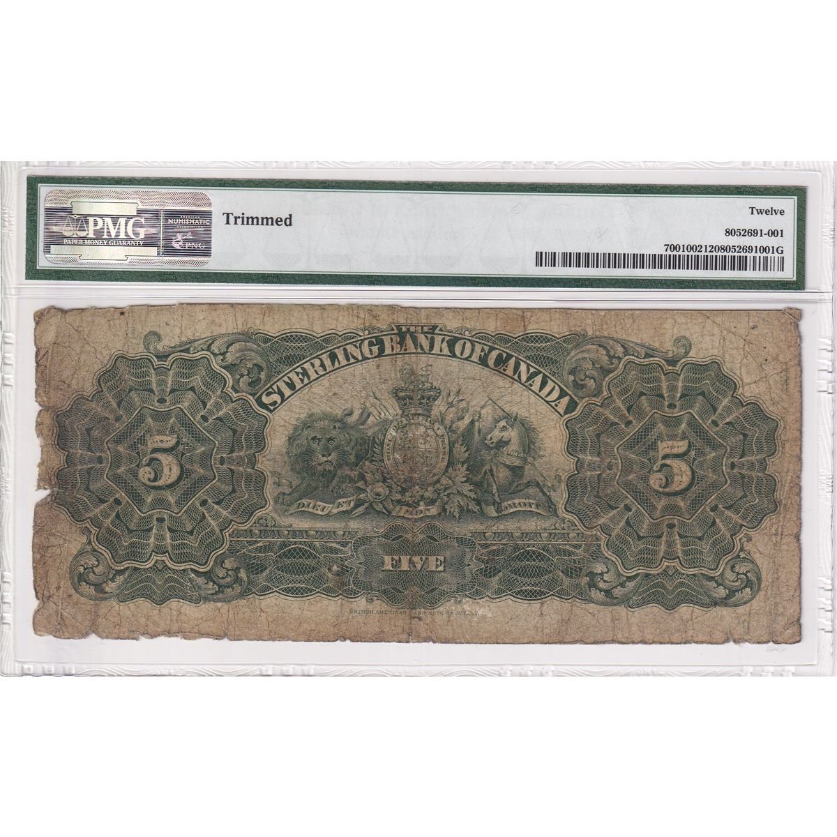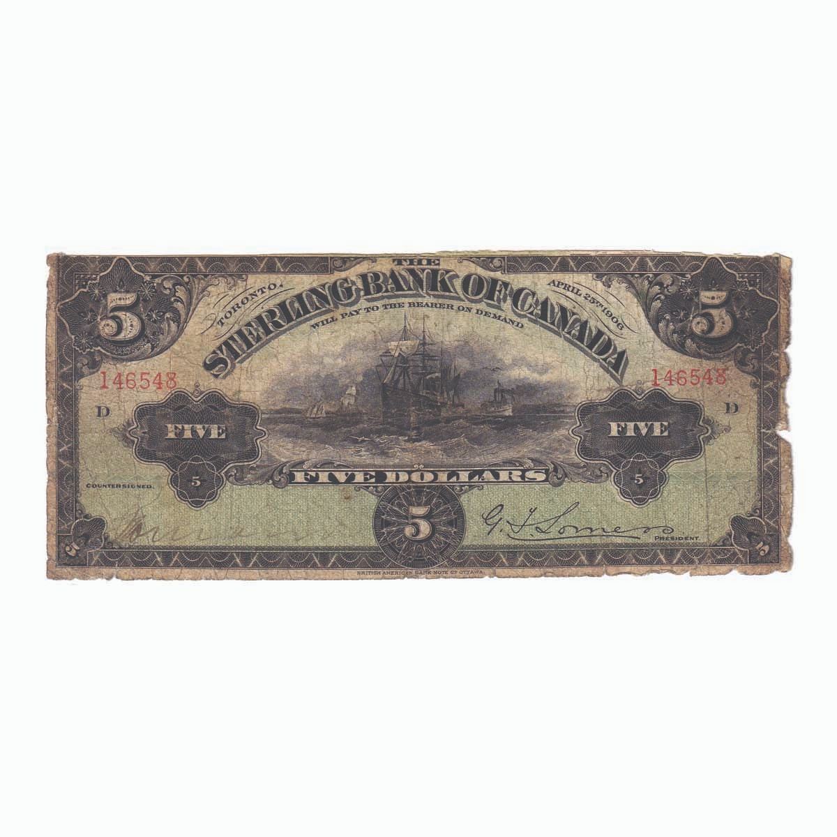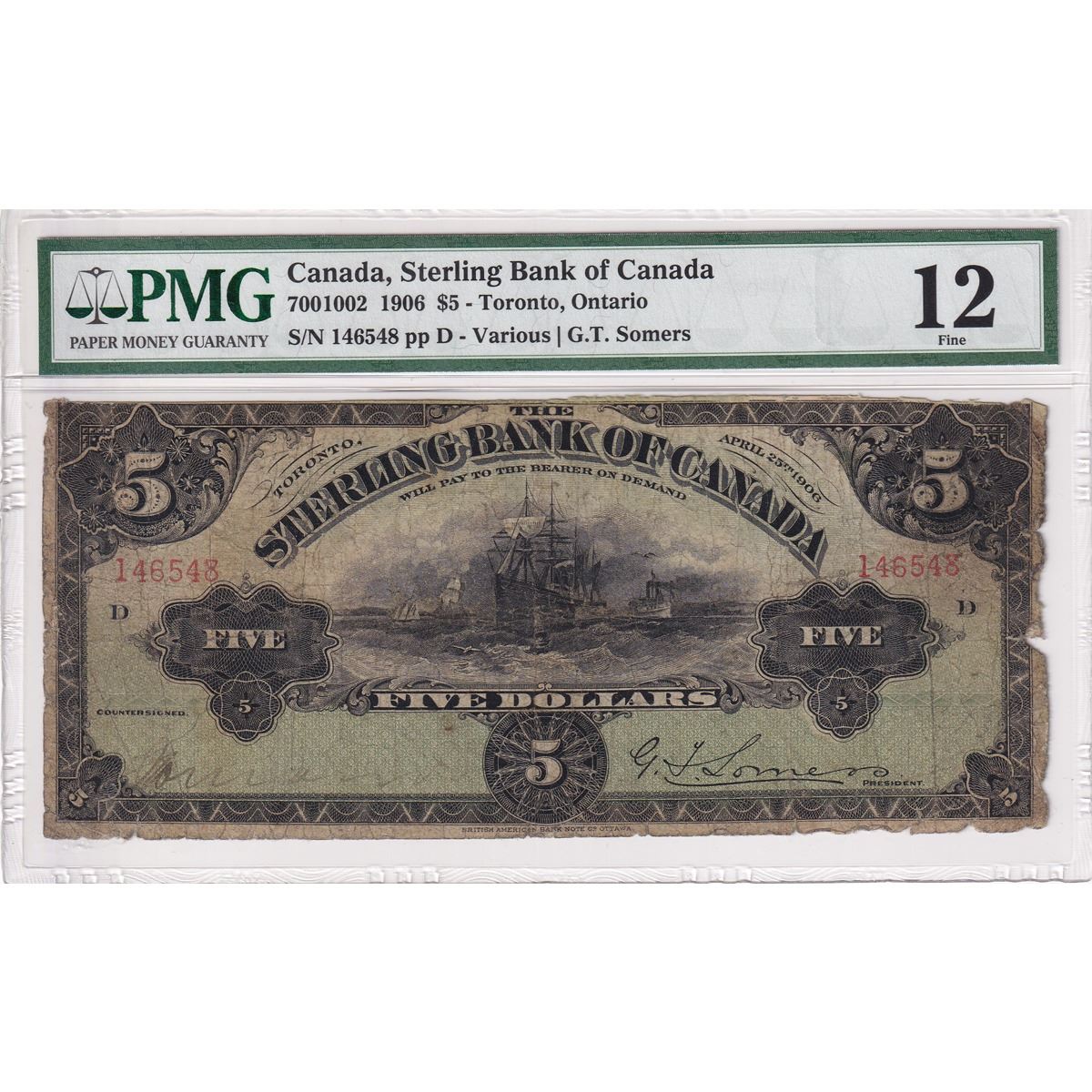 700-10-02. 1906 Sterling Bank of Canada $5, Various-Somers, S/N:146548 PMG F-12. Note has been trimmed and has some rough edges.