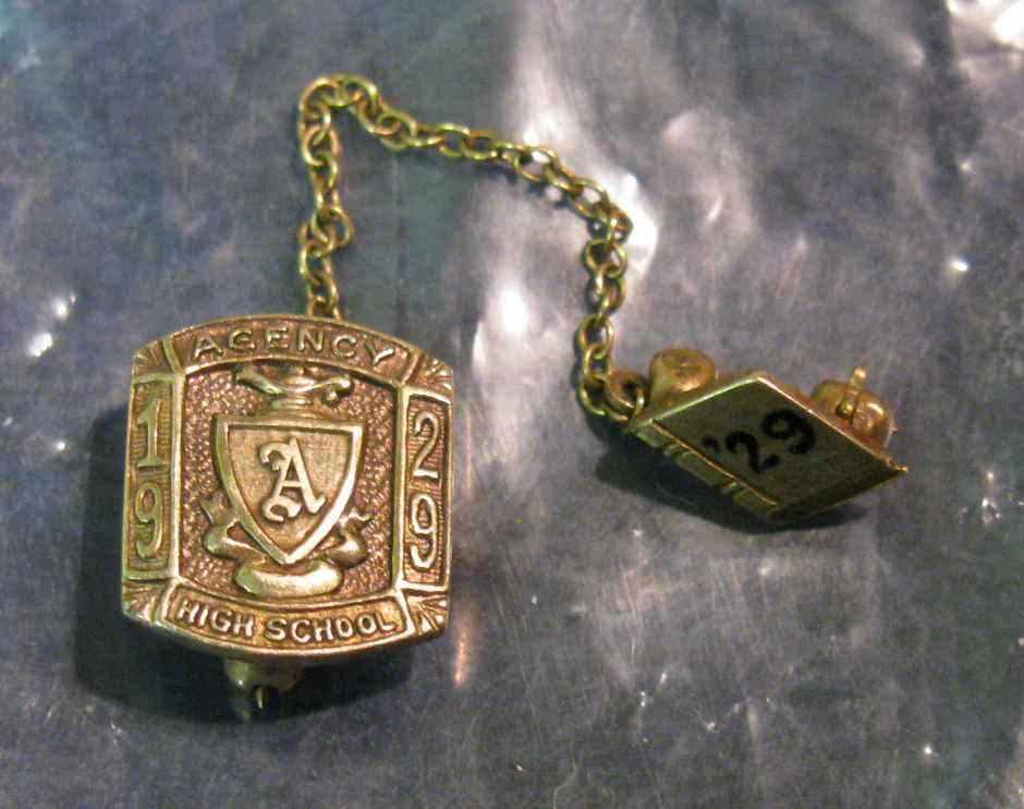 702. 1929 Agency (Iowa) High School 12K Gold Pin with dangle. This is the town, which had the old Indian Agency back in the early 1800s, which was managed by James Jordan.