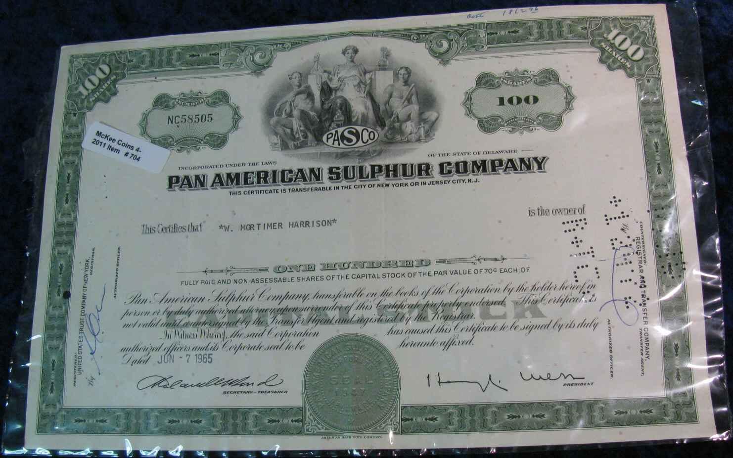 704. 1965 Stock Certificate for 100 Shares of "Pan American Sulphur Company" Stock. Hole cancelled.