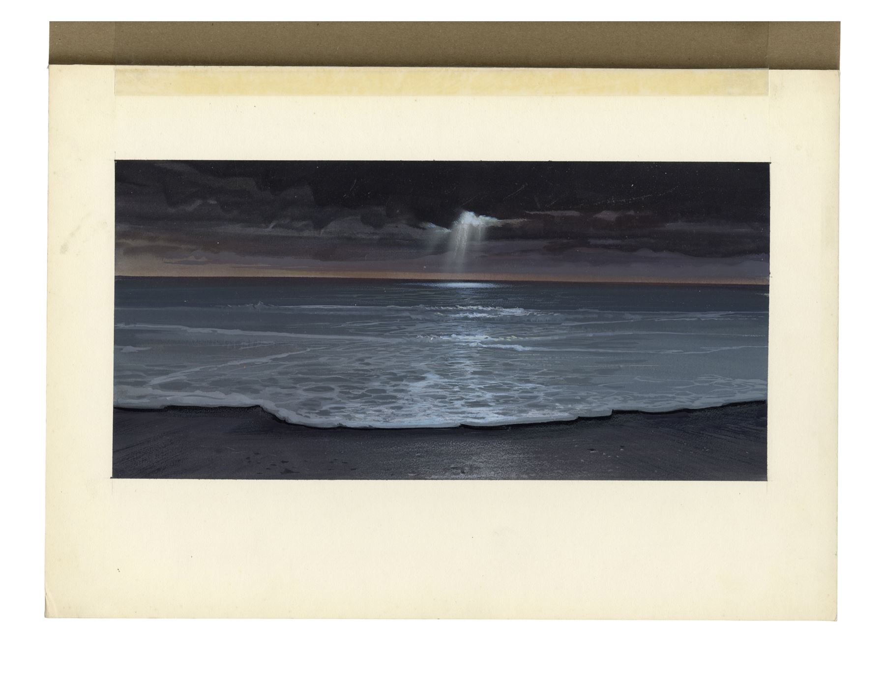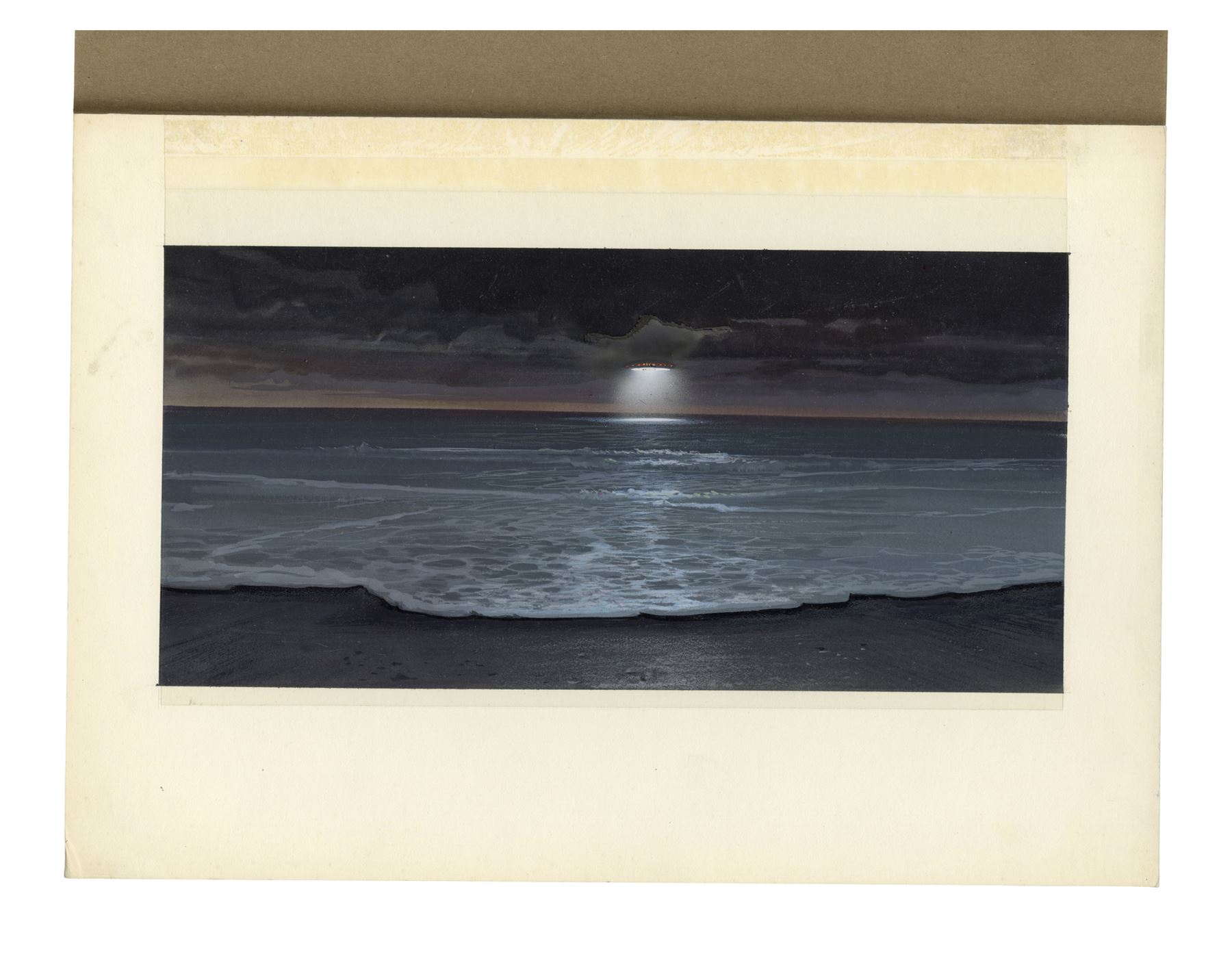 Created by film conceptual artist Ralph McQuarrie, this image of an alien spaceship hovering over a dark sea is rendered in mixed media on an acetate cel adhered to an illustration board with a brown paper cover taped over it. This painting exhibits discoloration around the edges. Dimensions: 10.5" x 15" x 0.25" (26.75 cm x 38.25 cm x 0.75 cm)