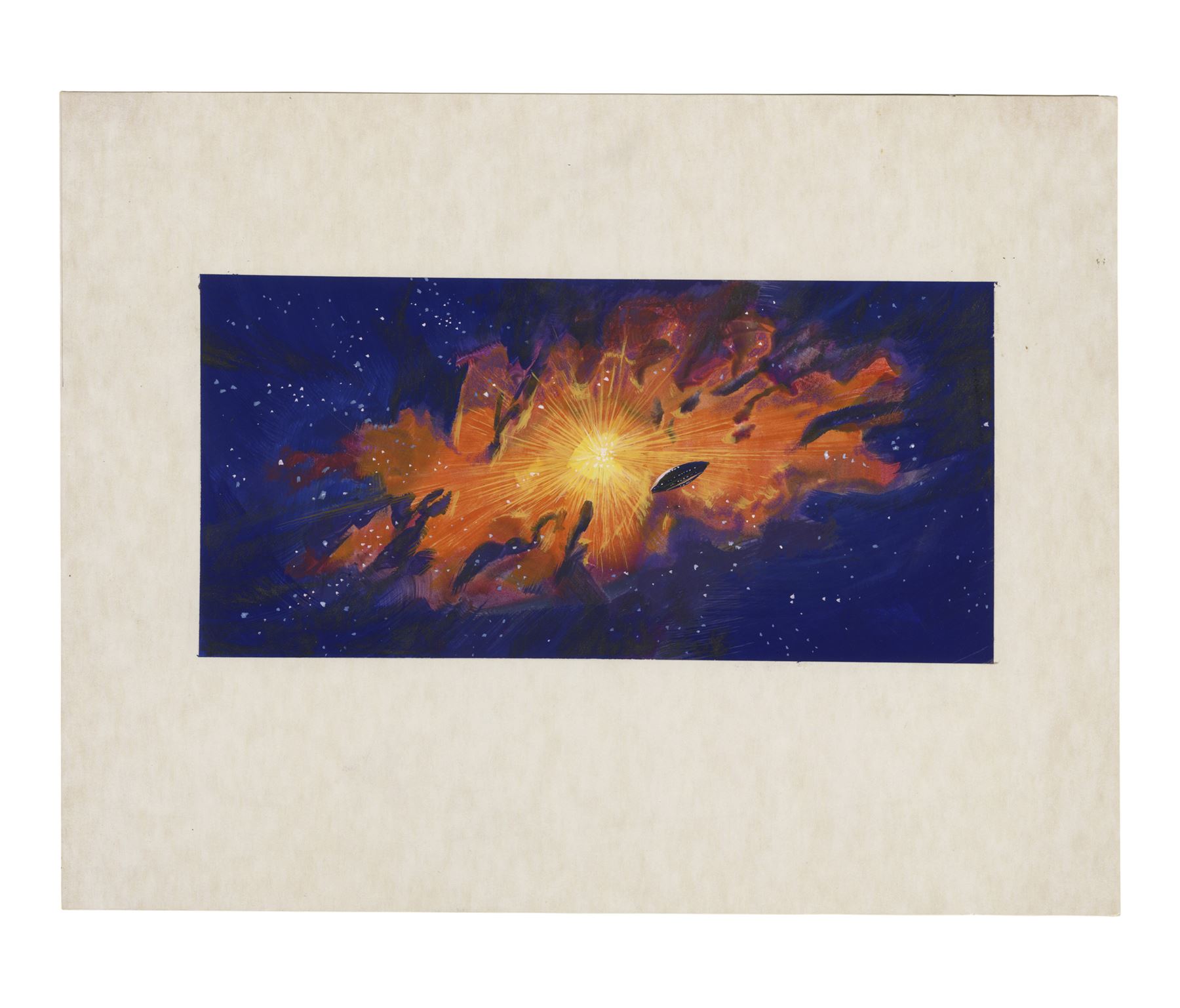 Created by film conceptual artist Ralph McQuarrie, this image of an alien spaceship in space traveling through cosmic clouds is rendered in mixed media on illustration paper. This painting exhibits discoloration around the edges. Dimensions: 8.5" x 11" (21.75 cm x 28 cm)