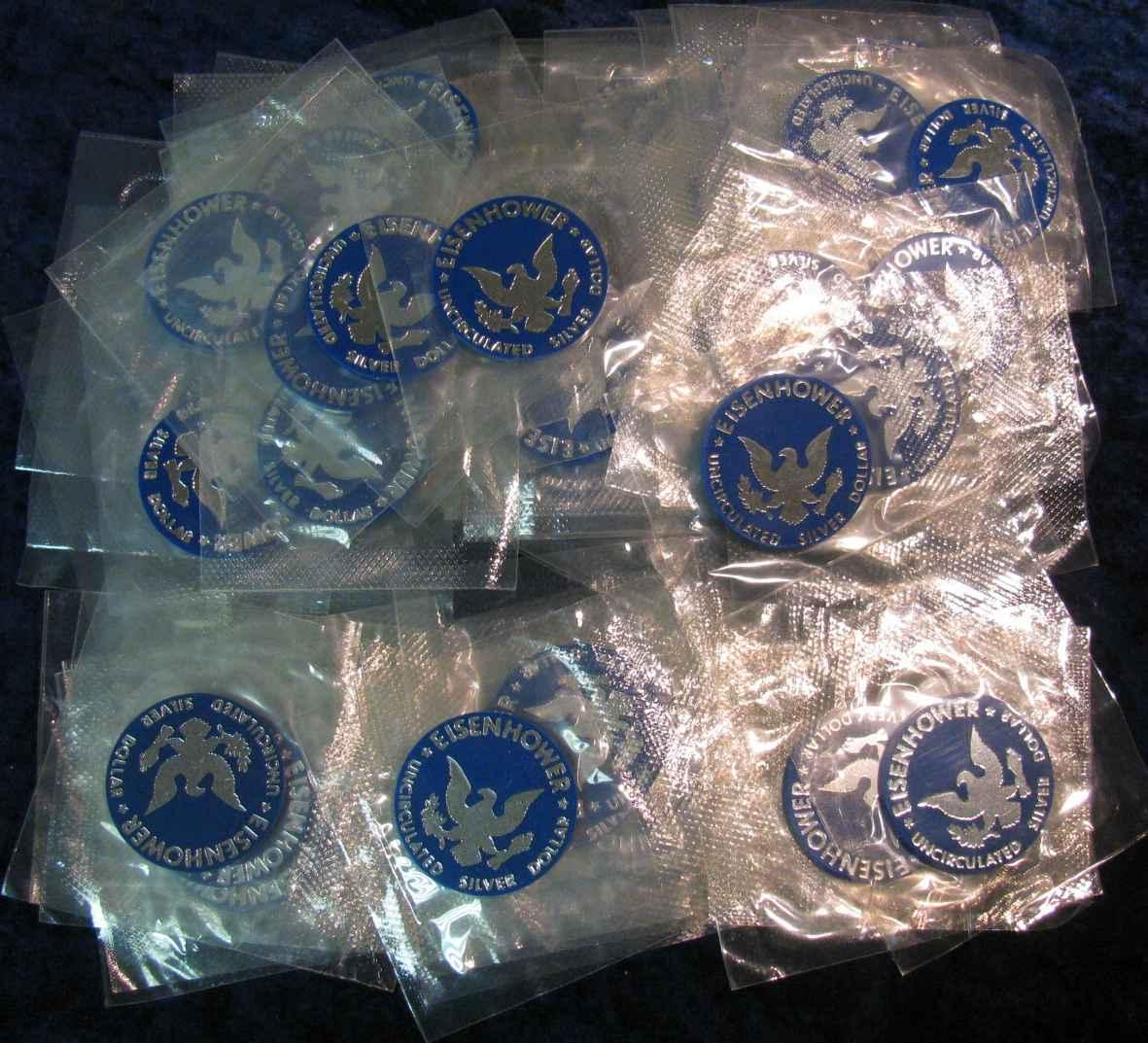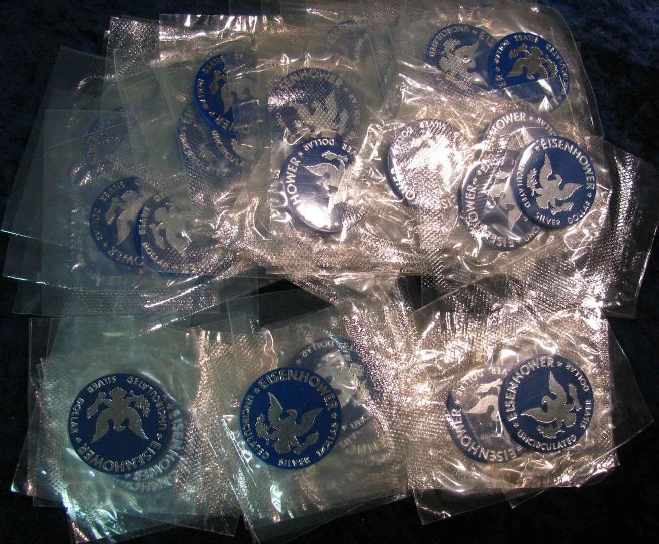 708. Large Group of "Eisenhower Silver Dollar" Tokens from original blue packs. Still in original cellophane. No Dollars in this group.
