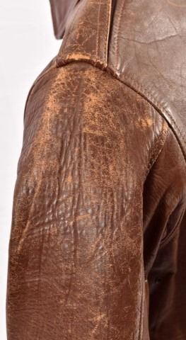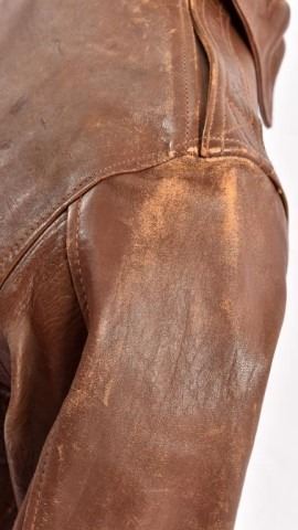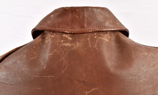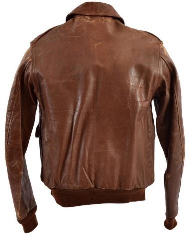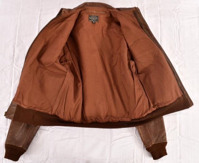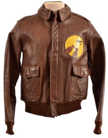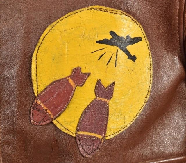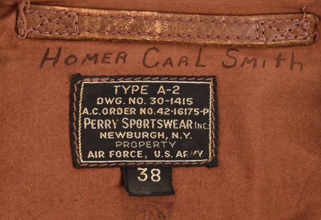 708th Bomb Squadron, Sgt. Homer Carl Smith. 1942. Printed in black ink between tag and hang up strap: "HOMER CARL SMITH". Tag: "TYPE A-2, DWG. NO. 30-1415, A.C. ORDER NO. 42-16175-P, PERRY SPORTSWEAR INC., NEWBURGH, N.Y., PROPERTY AIR FORCE, U.S. ARMY". Size: 38. Left breast: composite leather and painted patch for 708th Bomb Squadron and is an early version of the patch with a B-17 in silhouette dropping 2 dark red bombs with yellow stripes (later versions had 3 bombs). The 708th Bomb Squadron was involved in raids on marshaling yards, submarine pens, roads, bridges, naval installations, missile sites, German cities and participated in the Big Week along with supporting the beaches at Normandy. They also were involved at St. Lo and the Battle of the Bulge and Operation Varsity. Touched up in some places.