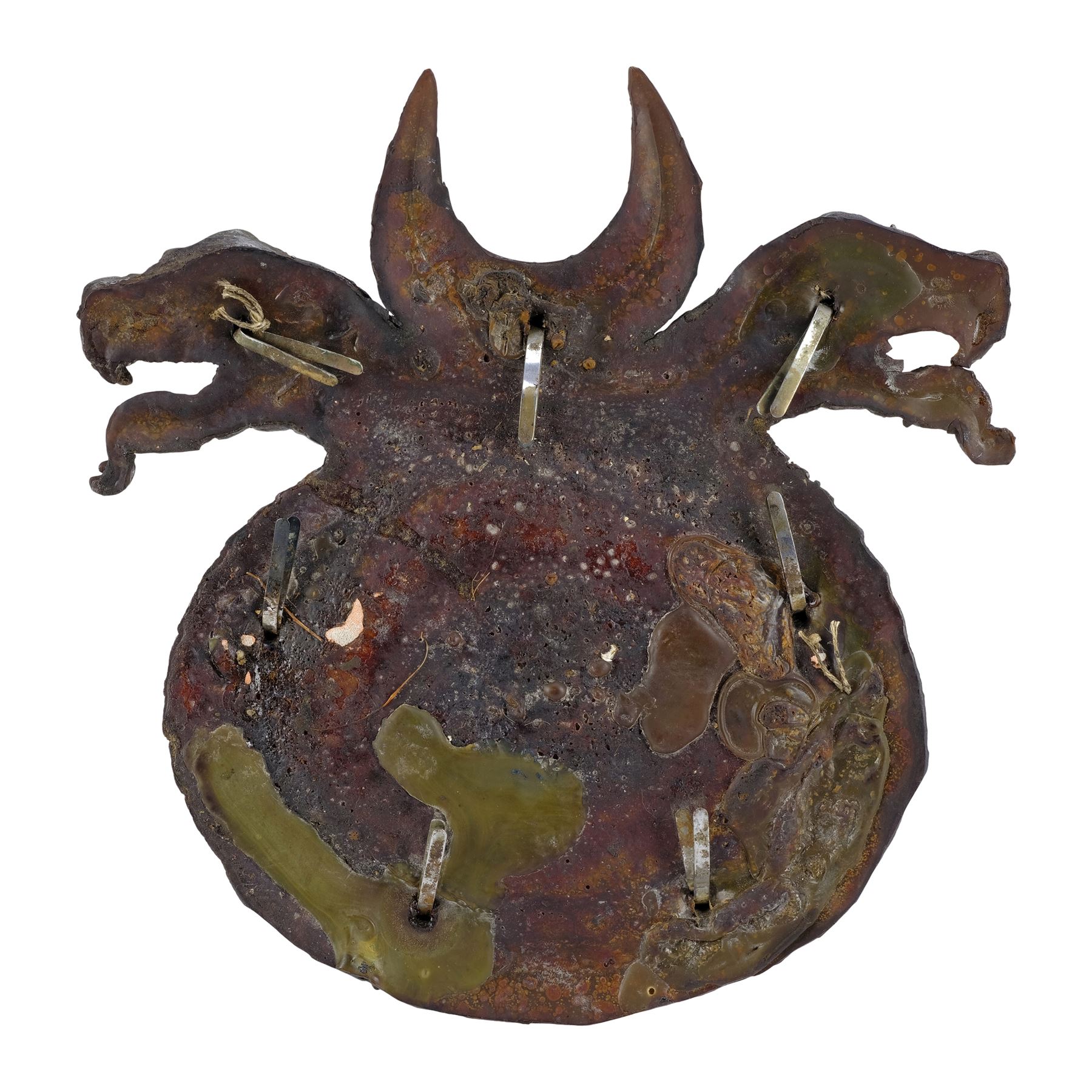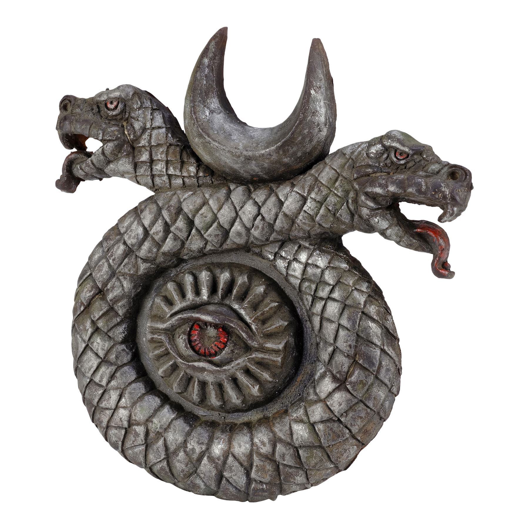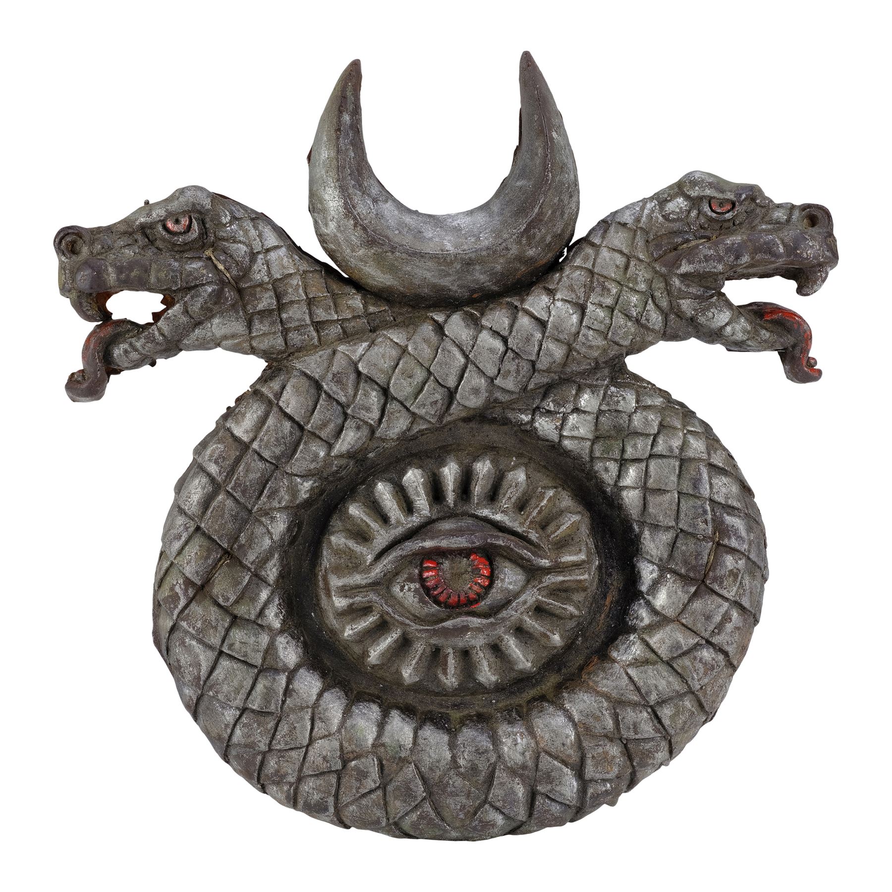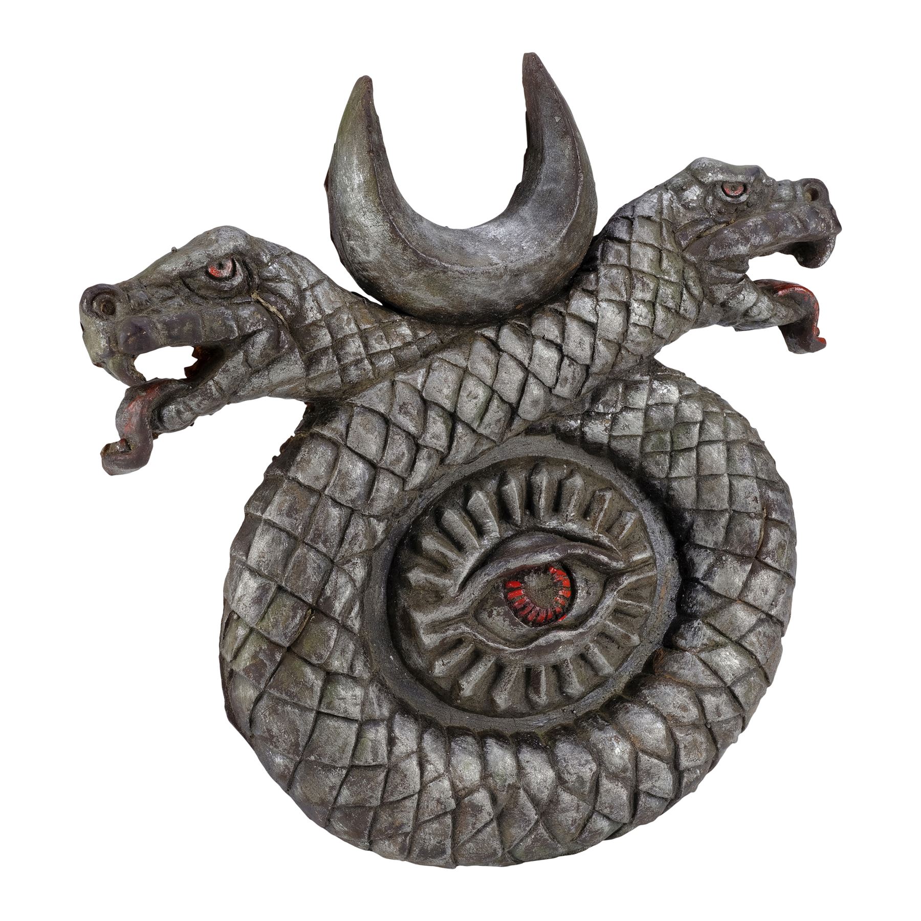 This metallic emblem is ornately sculpted with a crescent moon emblem, a red "all-seeing eye," and snake heads on each side with their tongues and eyes painted a matching red. Pins for affixing the emblem to armor are visible on the reverse. The emblem exhibits rusting, flaking paint, and adhesive residue on the reverse from production. Dimensions: 9" x 9" x 1" (23 cm x 23 cm x 2.5 cm)