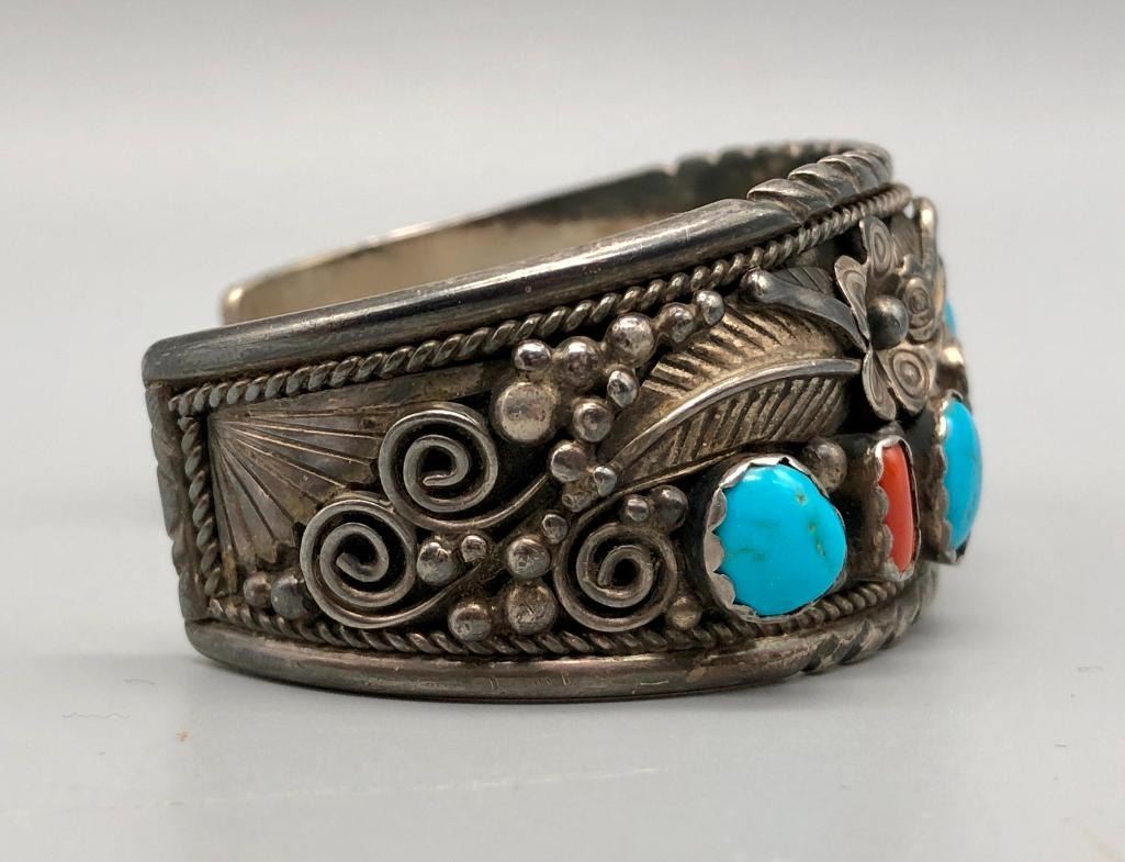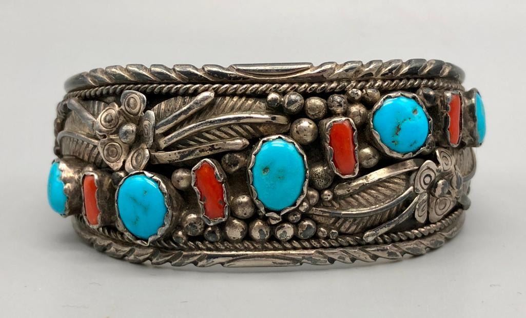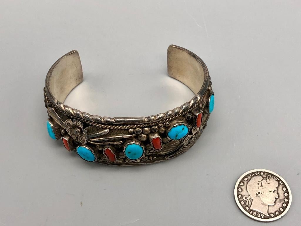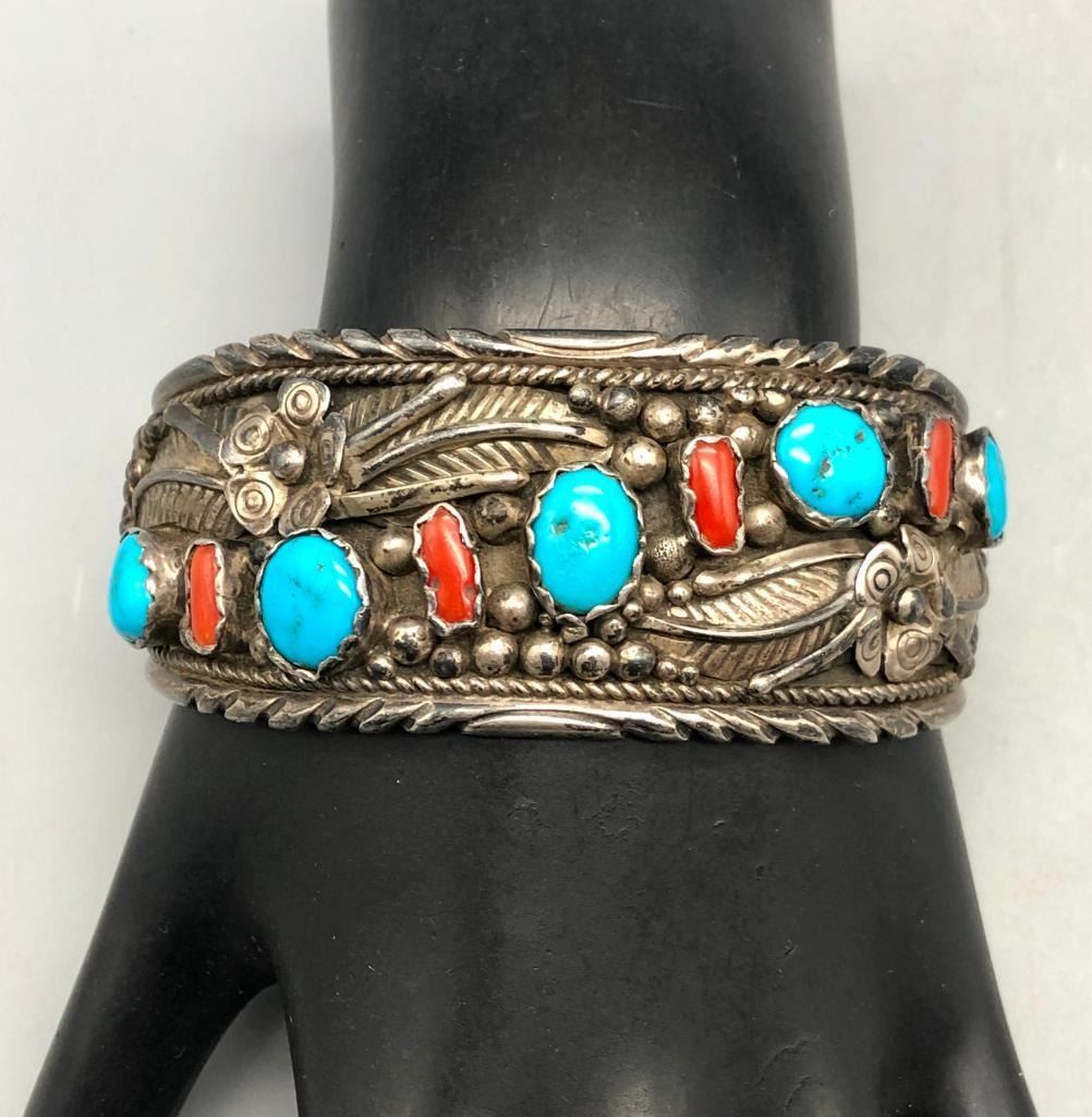Offered for sale in this lot is a vintage turquoise and coral bracelet. This is a great bracelet with five turquoise and four coral cabochons. Being highlighted with detailed floral applique and silver dots throughout is very indicative of the 70s style. It is sterling silver and very eye-catching. MAKER/ARTIST: Unmarked. APPROX AGE: Circa 1970s. SIZE: Inside circumference measures 5-7/8 inches long. Opening is an additional 1-5/8 inches, fitting a 7-1/2 inch wrist. Width is 1-1/4 inches. Weighs 66 grams. CONDITION: Good for its age, normal wear expected. Please look closely at the pictures as they are an important part of our description and are hereby incorporated into the description, specifically with regards to condition. SHIPPING: There will be a $5 handling / packaging fee for shipping this lot. The actual cost of postage will be added on top of that. BUY IT NOW: If you would like to buy this item now, without waiting for the auction day to bid on it, we do offer this option (which is available up to 48 hours before the actual auction starts). The “Buy it Now†price is the high estimate of this lot (plus applicable fees and the Buyer's premium is discounted to 10% when using the Buy it Now option). If you would like to exercise this option, you must contact us by email (or phone as long as you talk to someone live). Reference this lot number and your intention to "Buy it Now."