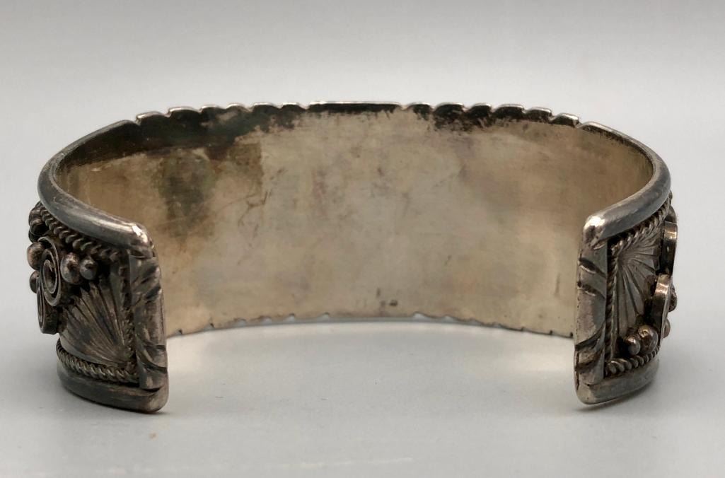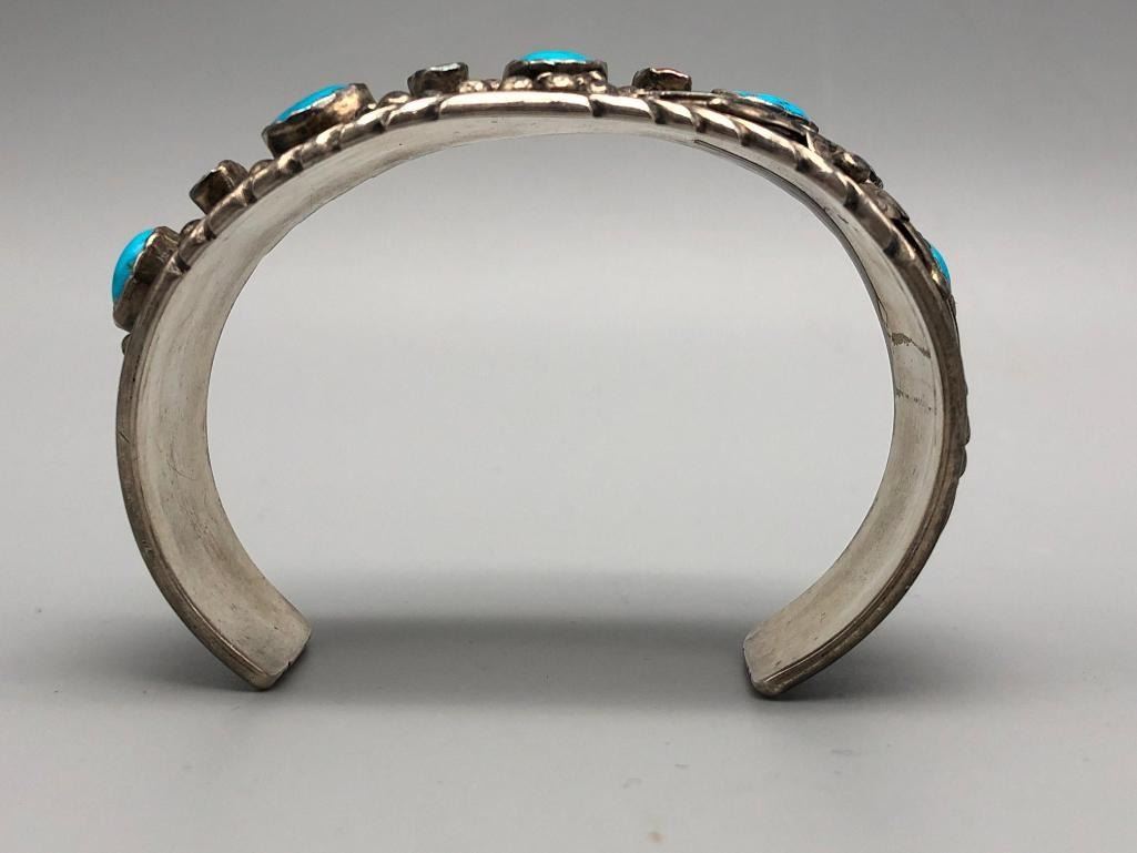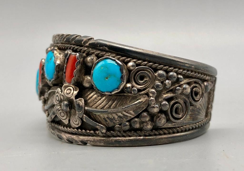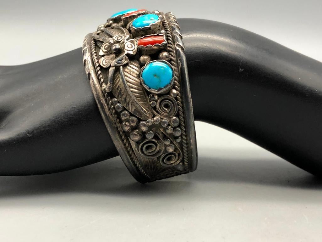 Offered for sale in this lot is a vintage turquoise and coral bracelet. This is a great bracelet with five turquoise and four coral cabochons. Being highlighted with detailed floral applique and silver dots throughout is very indicative of the 70s style. It is sterling silver and very eye-catching. MAKER/ARTIST: Unmarked. APPROX AGE: Circa 1970s. SIZE: Inside circumference measures 5-7/8 inches long. Opening is an additional 1-5/8 inches, fitting a 7-1/2 inch wrist. Width is 1-1/4 inches. Weighs 66 grams. CONDITION: Good for its age, normal wear expected. Please look closely at the pictures as they are an important part of our description and are hereby incorporated into the description, specifically with regards to condition. SHIPPING: There will be a $5 handling / packaging fee for shipping this lot. The actual cost of postage will be added on top of that. BUY IT NOW: If you would like to buy this item now, without waiting for the auction day to bid on it, we do offer this option (which is available up to 48 hours before the actual auction starts). The “Buy it Now†price is the high estimate of this lot (plus applicable fees and the Buyer's premium is discounted to 10% when using the Buy it Now option). If you would like to exercise this option, you must contact us by email (or phone as long as you talk to someone live). Reference this lot number and your intention to "Buy it Now."