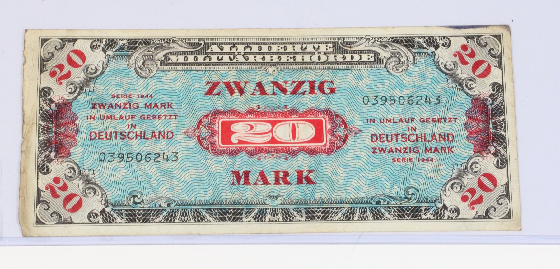 WW2 WORLD WAR TWO ALLIED MILITARY OCCUPATION OF GERMANY 20 MARK ZWANZIG MARK PAPER MONEY BILL NOTE DEUTSCHLAND SERIES 1944 ALLIIERTE MILITÄRBEHÖRDE