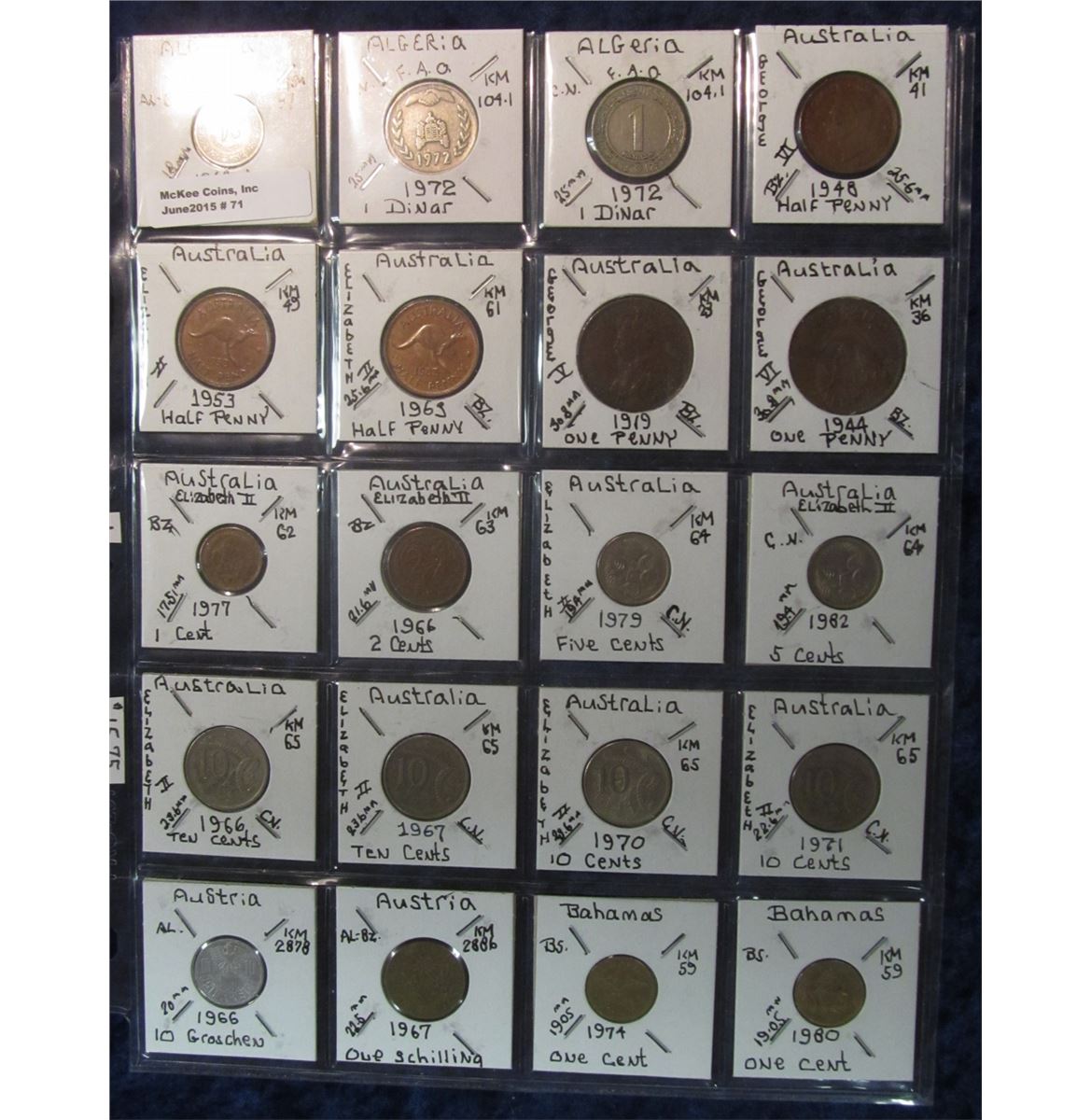 71. (20) World Coins in a Plastic Page identified with KM No., Metal size, & etc. All different. Includes: Algeria, Australia, Austria, & Bahamas. KM Value on this group is $15.75.