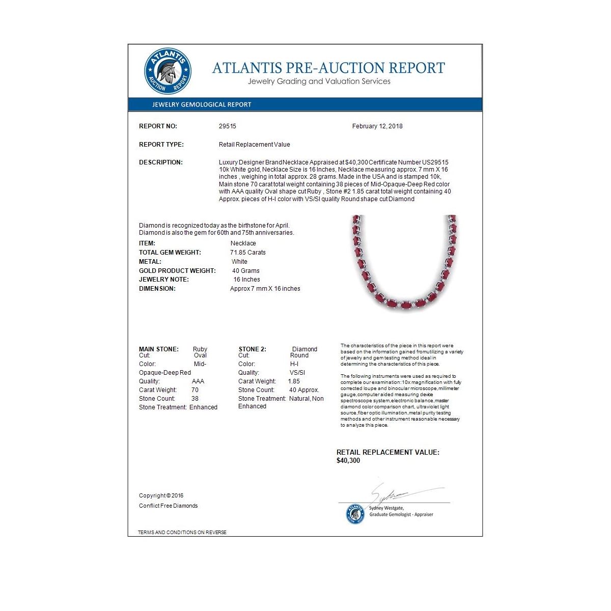 REF-563H6A -29515 ---- 71.85 CTW Ruby & VS/SI Certified Diamond Eternity Necklace 10K White Gold ---- Luxury Designer Brand Necklace Appraised at $40,300 Certificate Number US29515 10k White gold, Necklace Size is 16 Inches, Necklace measuring approx. 7 mm X 16 inches , weighing in total approx. 28 grams. Made in the USA and is stamped 10k, Main stone 70 carat total weight containing 38 pieces of Mid-Opaque-Deep Red color with AAA quality Oval shape cut Ruby , Stone #2 1.85 carat total weight containing 40 Approx. pieces of H-I color with VS/SI quality Round shape cut Diamond