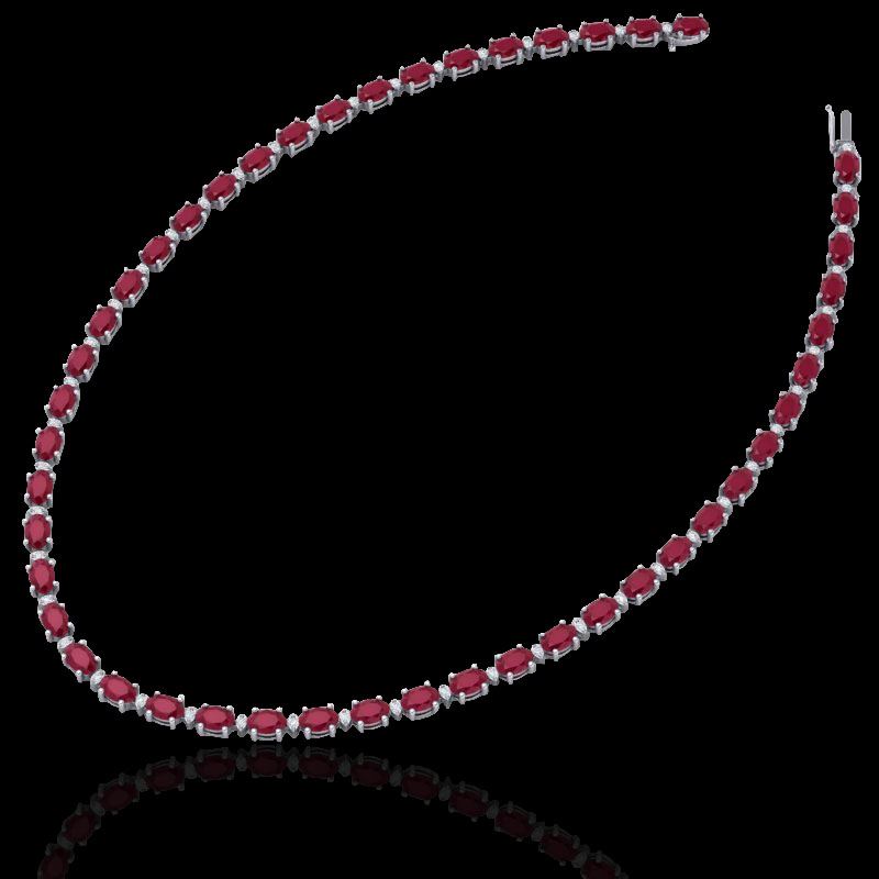 REF-563M6H -29515 ---- 71.85 CTW Ruby & VS/SI Certified Diamond Eternity Necklace 10K White Gold ---- Luxury Designer Brand Necklace Appraised at $40,300 Certificate Number US29515 10k White gold, Necklace Size is 16 Inches, Necklace measuring approx. 7 mm X 16 inches , weighing in total approx. 28 grams. Made in the USA and is stamped 10k, Main stone 70 carat total weight containing 38 pieces of Mid-Opaque-Deep Red color with AAA quality Oval shape cut Ruby , Stone #2 1.85 carat total weight containing 40 Approx. pieces of H-I color with VS/SI quality Round shape cut Diamond