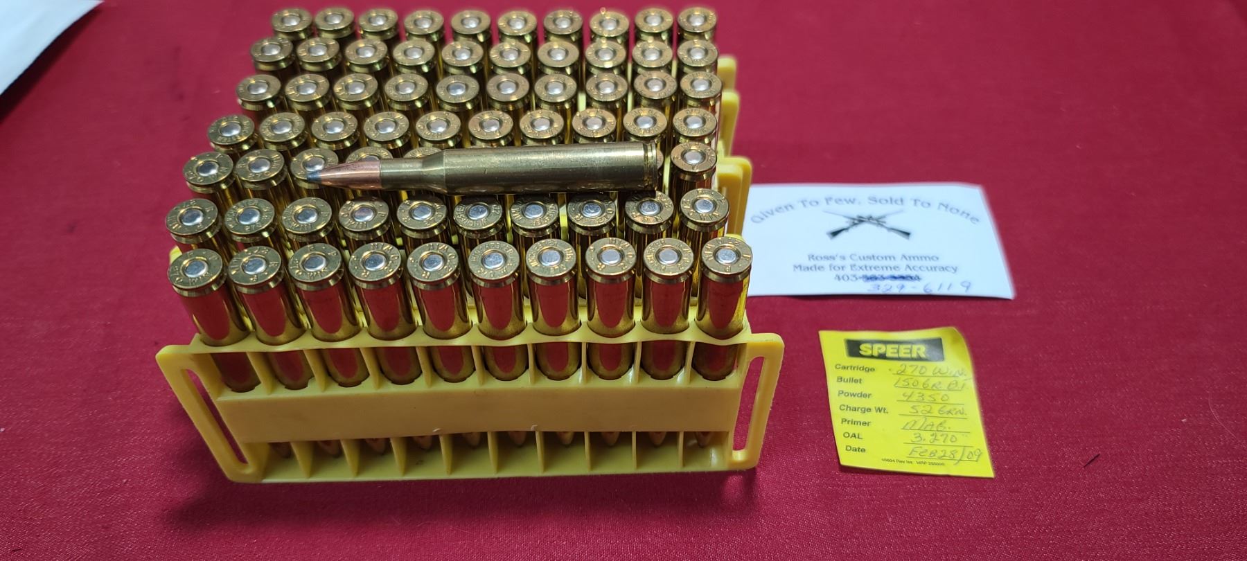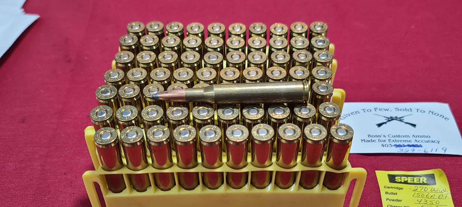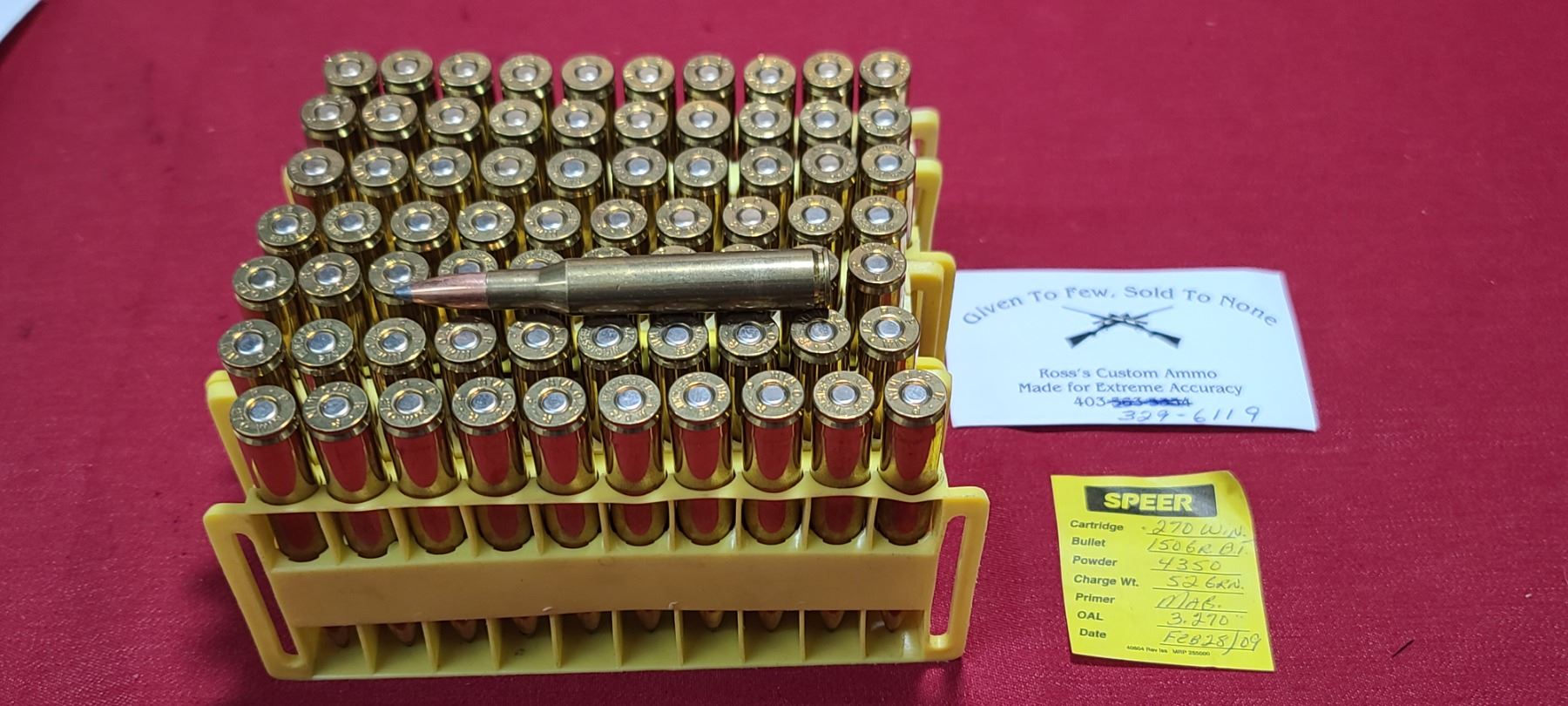 71 ROUNDS OF .270 WIN 150GR BT 4350 POWDER 52GR - MAG PRIMED OAL 3.270 BY ROSS'S CUSTOM AMMO NO SHIPPING ON AMMUNITION