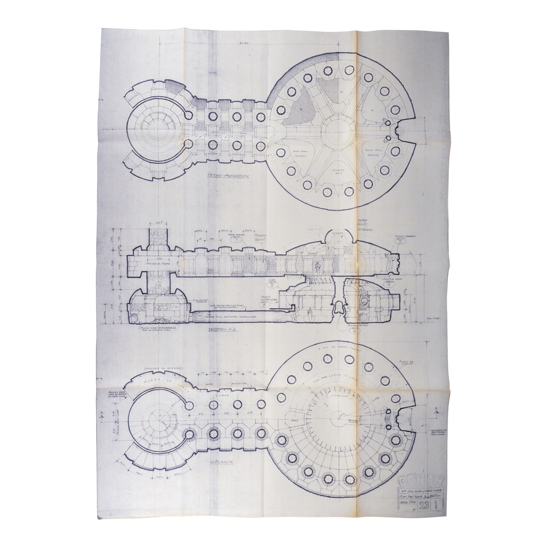 This lot consists of 10 printed and folded blueprints of the interior Idol Room and Snake Chamber. Sections included are the central columns, the first floor, altar, altar and various details of the idol, and columns. These blueprints exhibit discoloration around the fold creases, as well as fading print and tearing edges. Dimensions: (largest) 42" x 34" (106.75 cm x 86.5 cm)