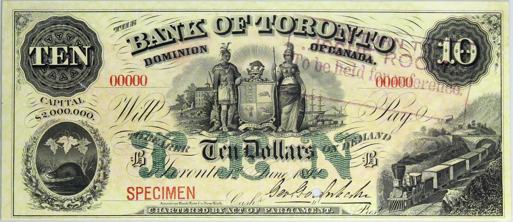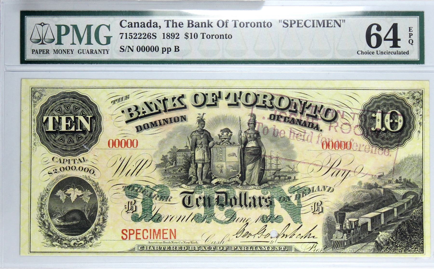 715-22-26S 1892 Bank of Toronto SPECIMEN $10 PMG Certified Choice UNC-64 EPQ!