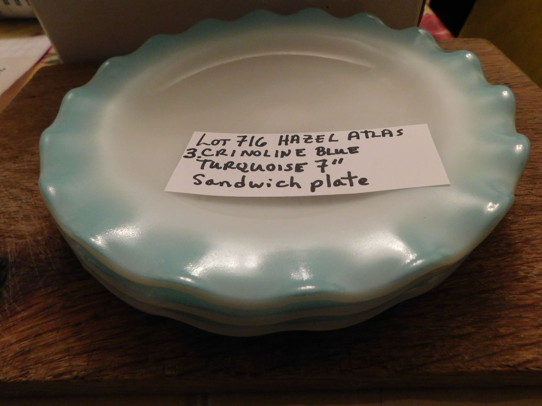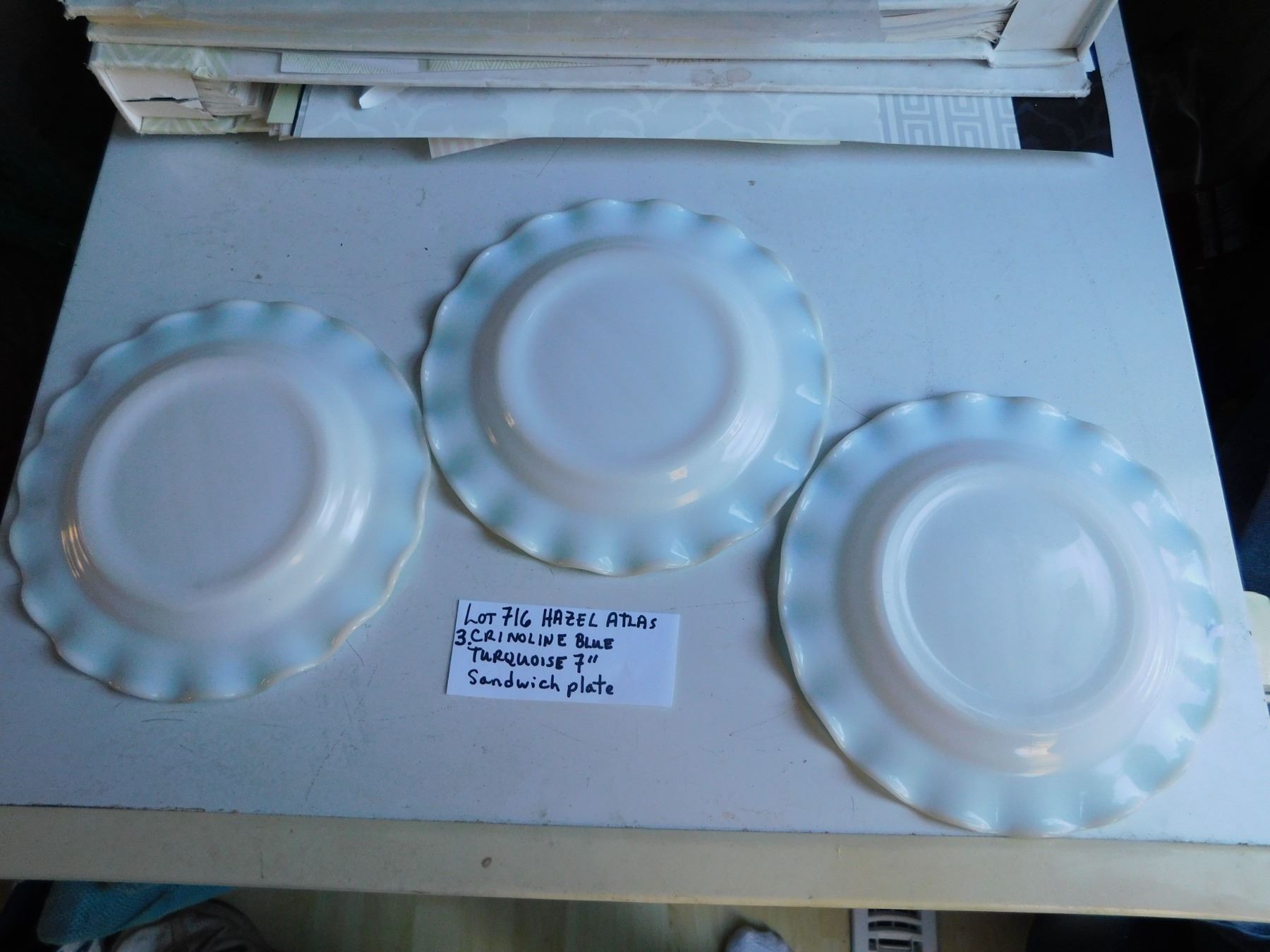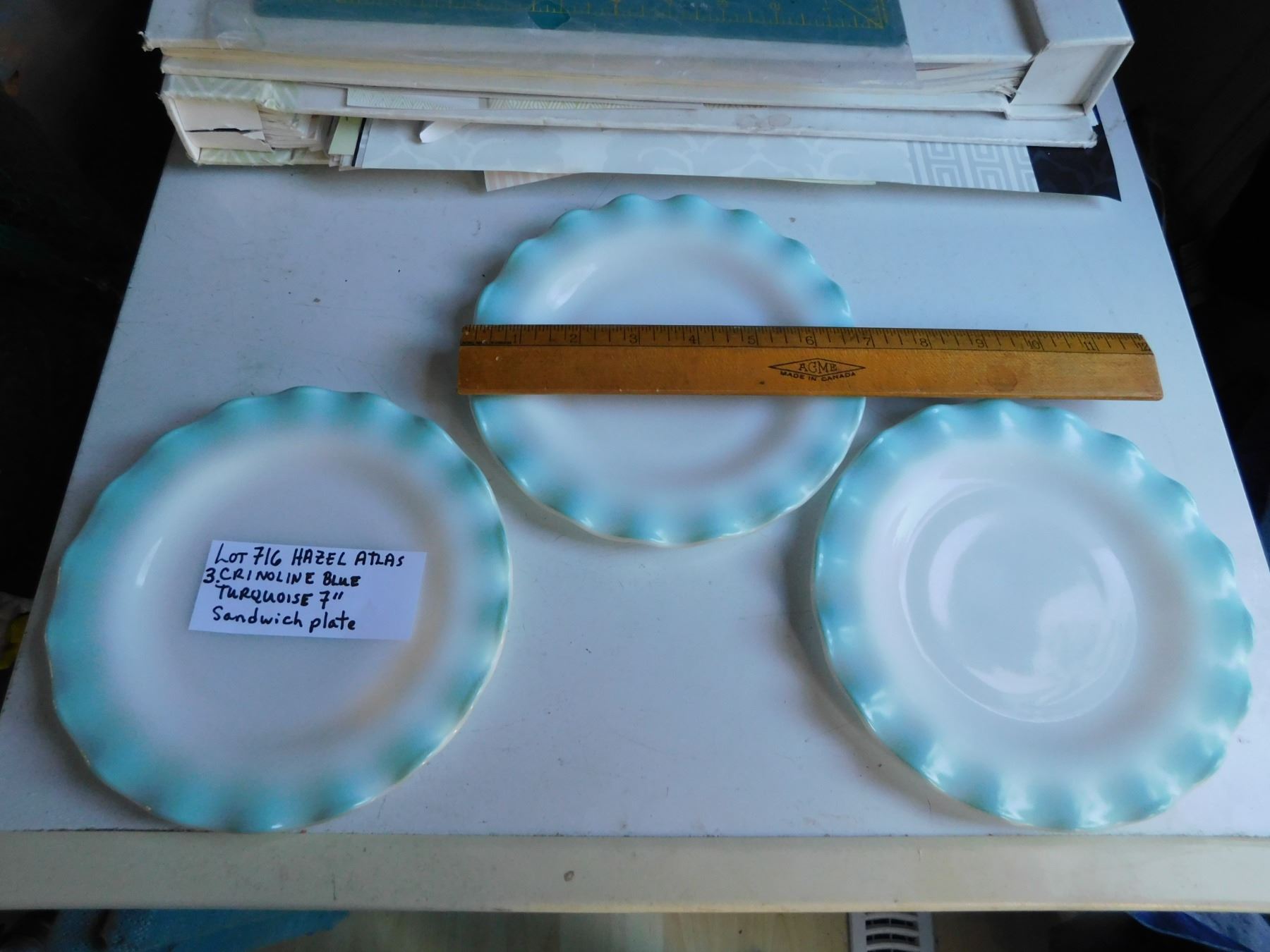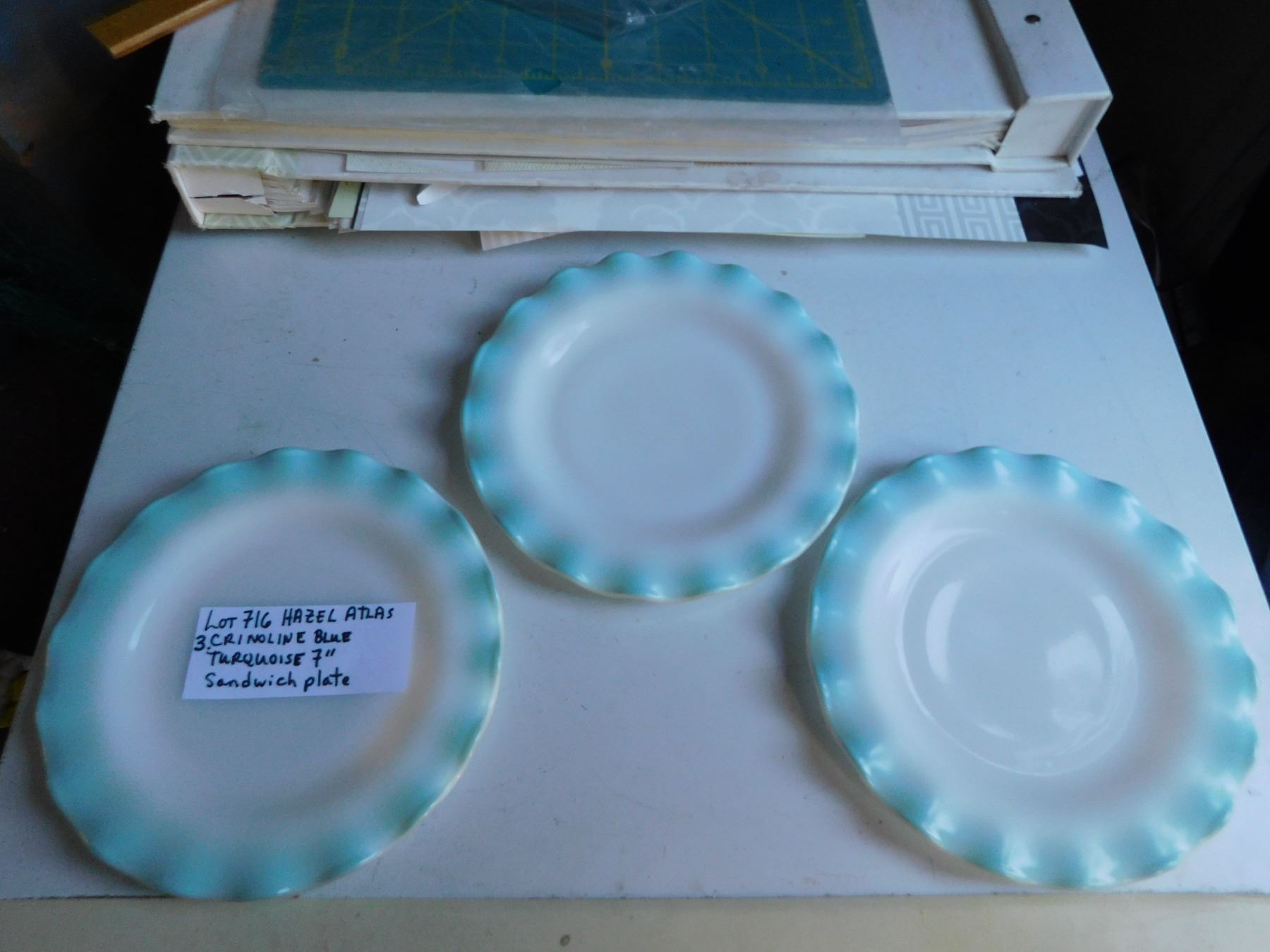 716 CRINOLINE BLUE & WHITE HAZEL ATLAS SET OF 3 SANDWICH PLATES