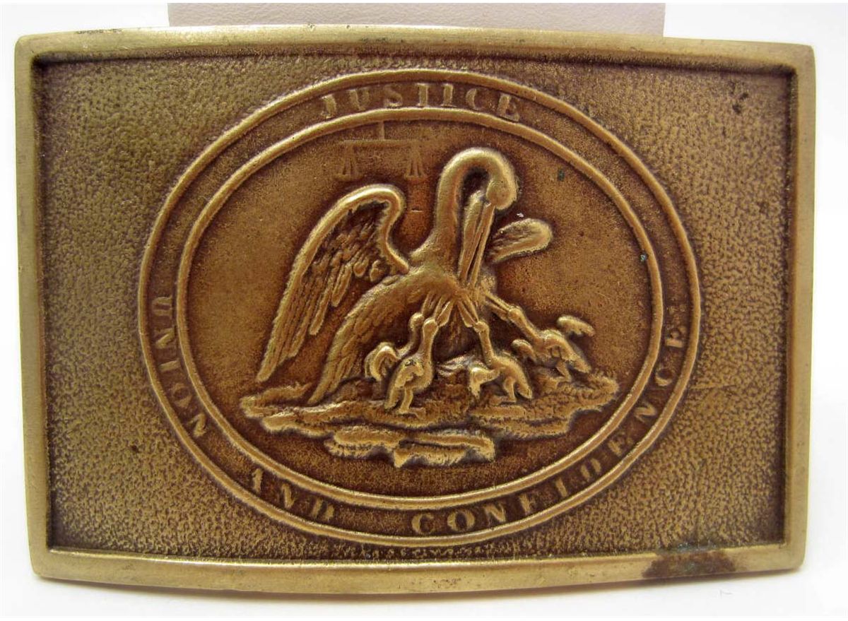 CONFEDERATE STATES LOUISIANA CIVIL WAR BELT BUCKLE - Pelican on front, feeding her young. Says 'Justice & Confidence' - Solid Brass