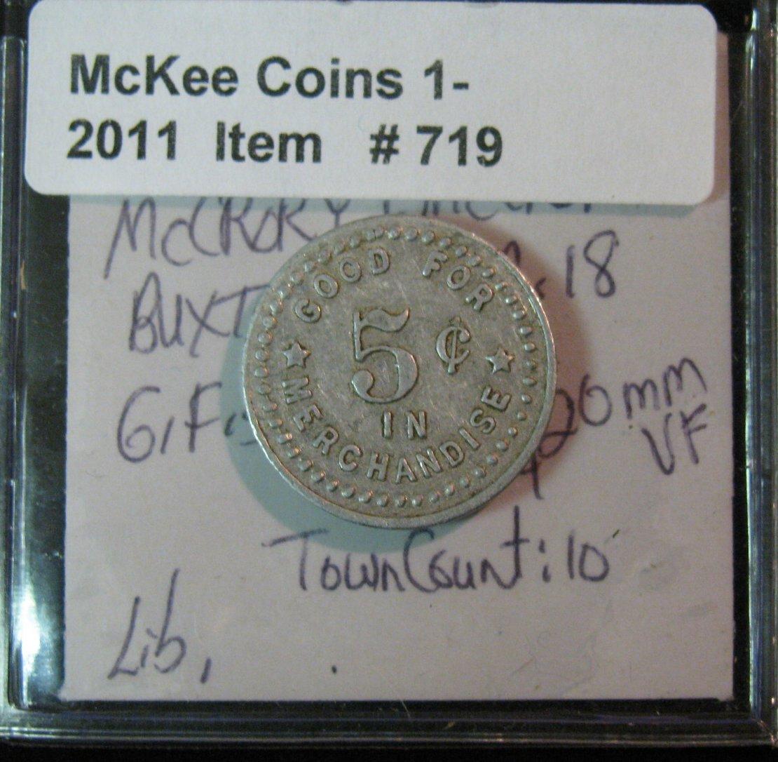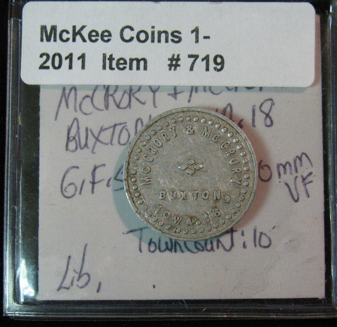 719. Buxton, Iowa Good For 5c in Merchandise Trade Token "Mc Crory & Mc Crory/Buxton,/Iowa". Rd., Alum., 20mm. VF.