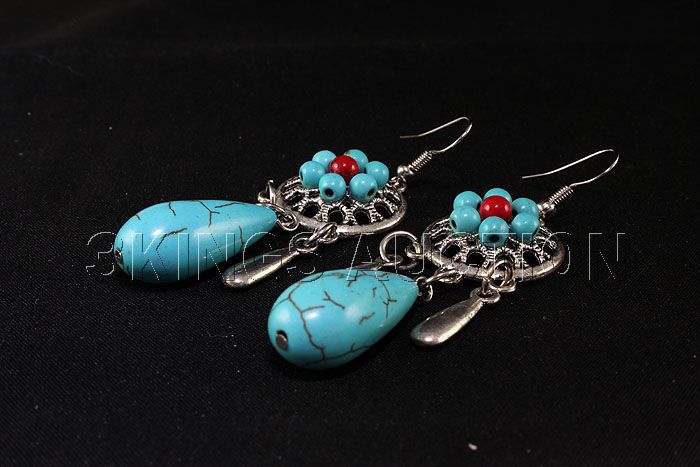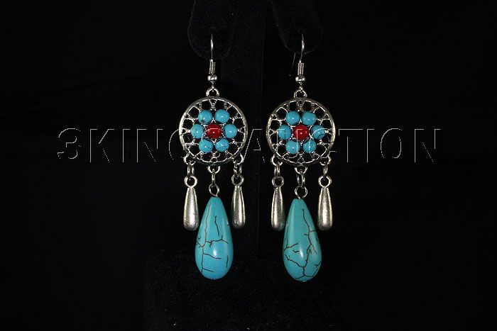 72.81ctw Teardrop Turquoise Silver Dangling Earring **|**|** Dream Catcher Design Silver Hook Earring with Blue Turquoise Gemstone; pear size: 23.17x11.93mm; long: 2.3 inches ; MSRP: $300