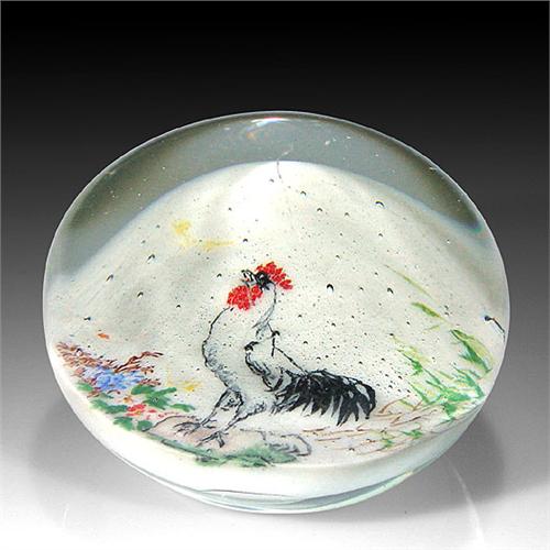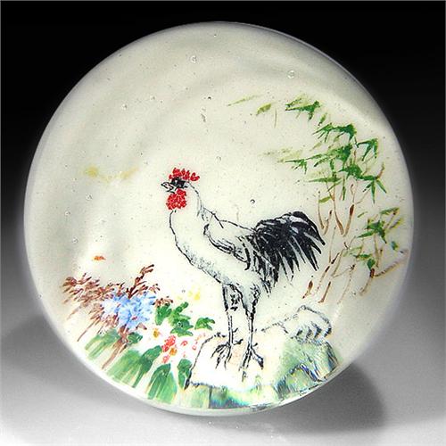 Chinese painted rooster paperweight. The piece depicts a rooster, with bamboo and assorted flowers, on white ground. Diameter 2 3/4". Surface wear. NO RESERVE