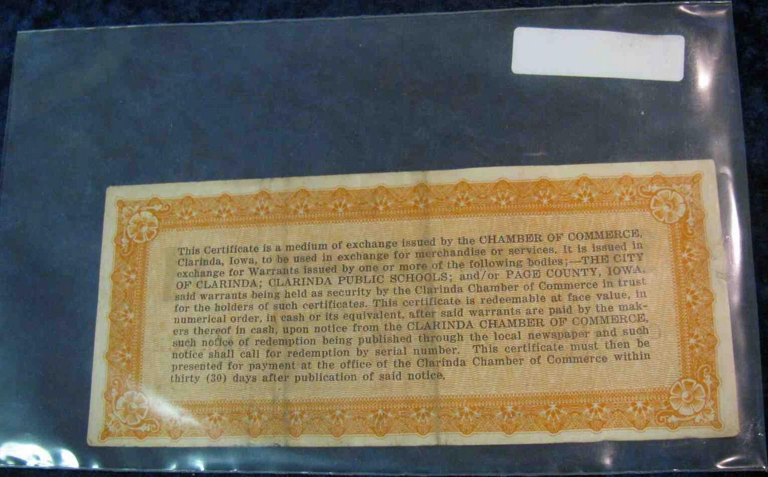72. One Dollar Depression Scrip Issued April 10, 1933 Clarinda Chamber of Commerce.