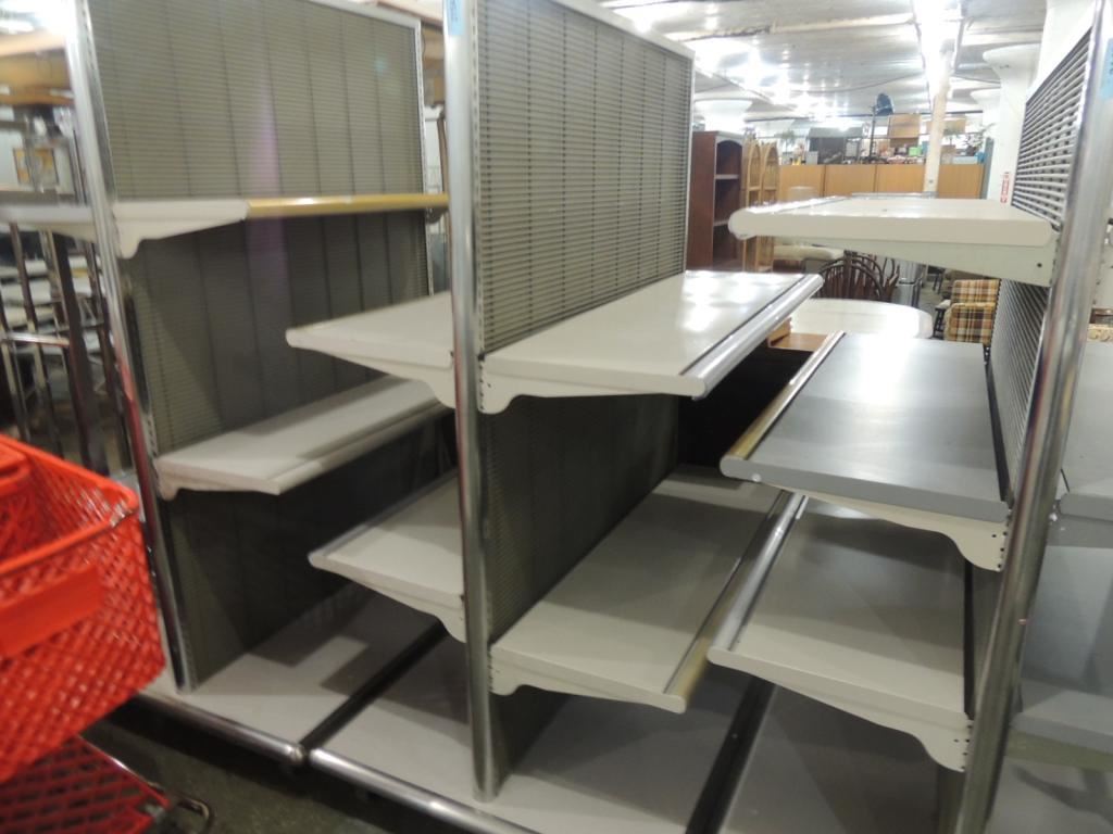 WHEELED SHELVING, MERCHANDISE SHELVING, DISPLAY SHELF, STORE SHELF, GONDOLA SHELF, ADJUSTABLE SHELF, SHOPPING SHELF, STORAGE SHELVING, WHEELS, AS SHOWN SEE PHOTO FOR MORE DETAILS.
