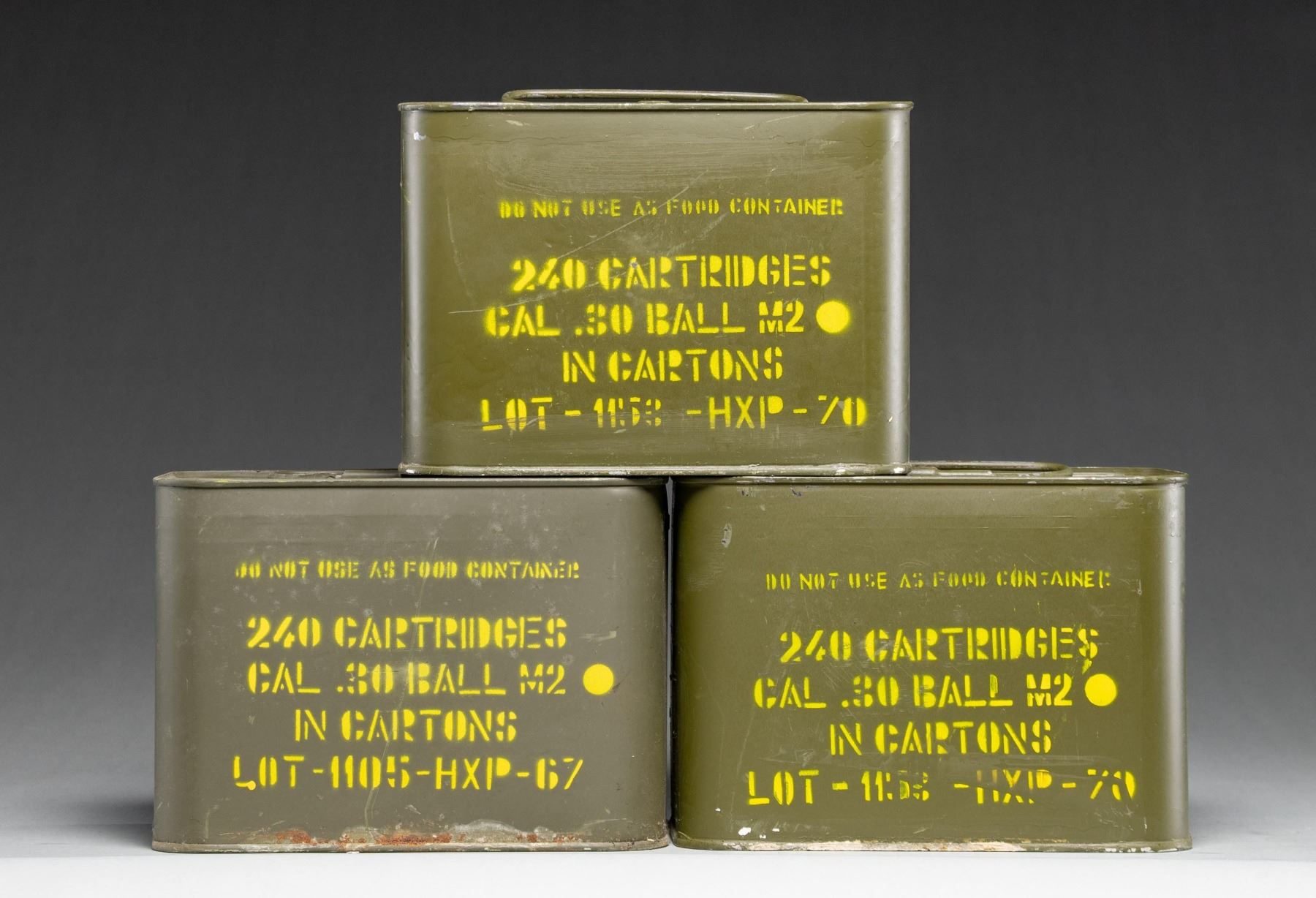 720 rds. of Greek HXP 30-06 ammo in three sealed cans. CONDITION: sealed in green ammo cans. (02-25027-10/MJC). $500-700 for lot.
