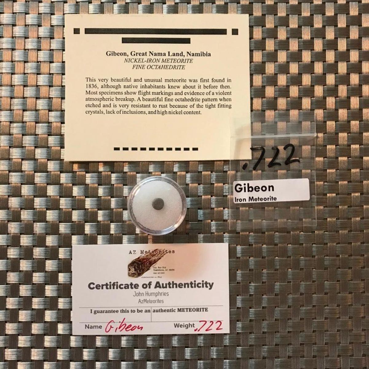 .722 grams Gibeon iron meteorite, lightly polished & cut disk coin in display case. 6mm diameter X 4mm thick. Perfect specimen for mounting as a ring or pendant. Comes with certificate of authenticity. Official meteorite name - Gibeon Year found: 1836 Country: Namibia Mass: 26 MT From the collection of John Humphries in Tombstone AZ. Â