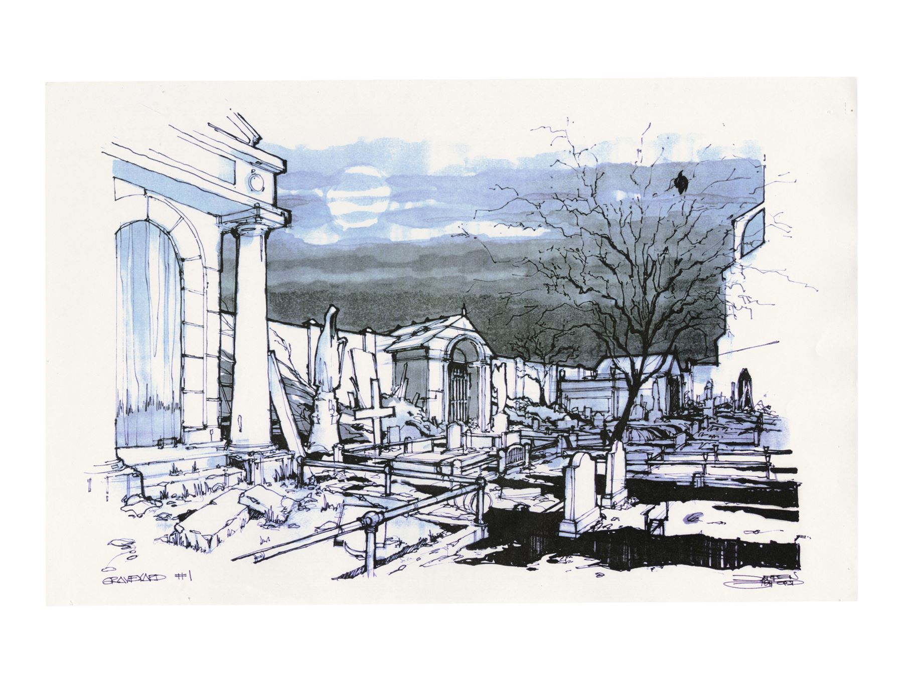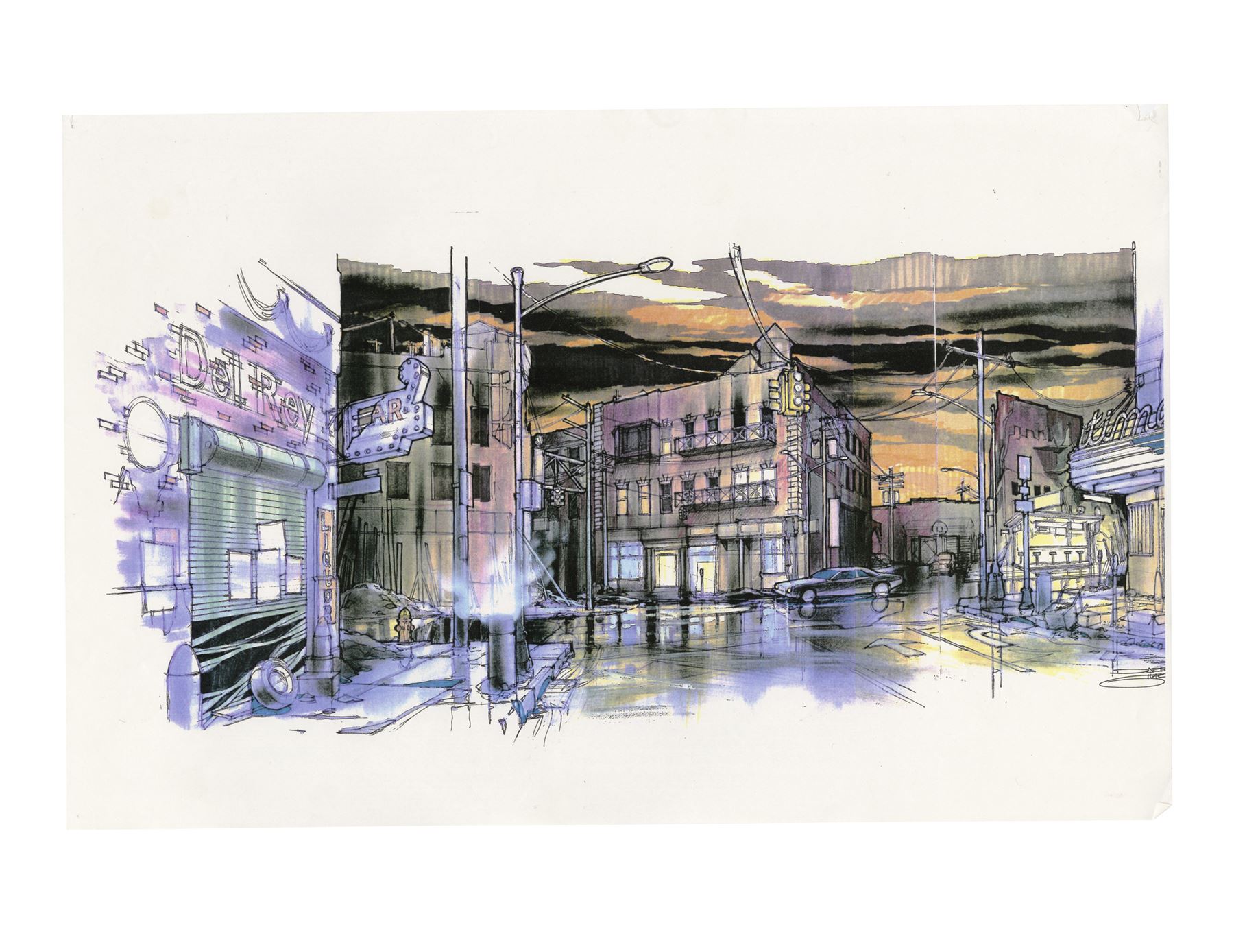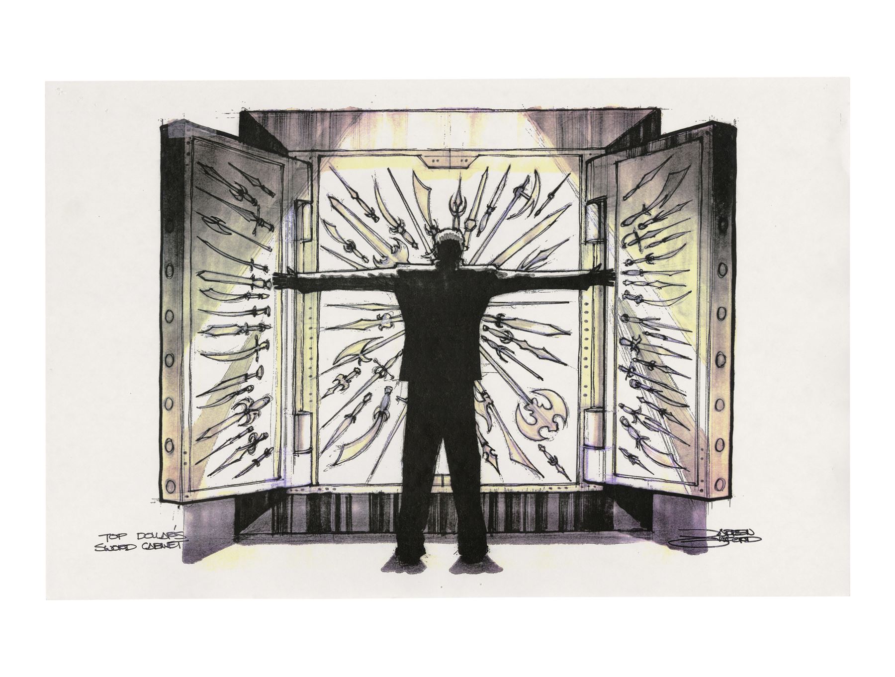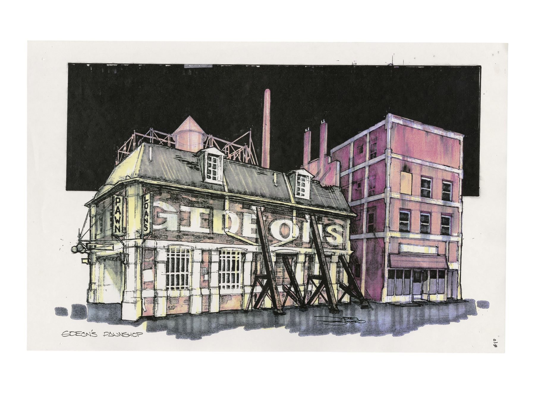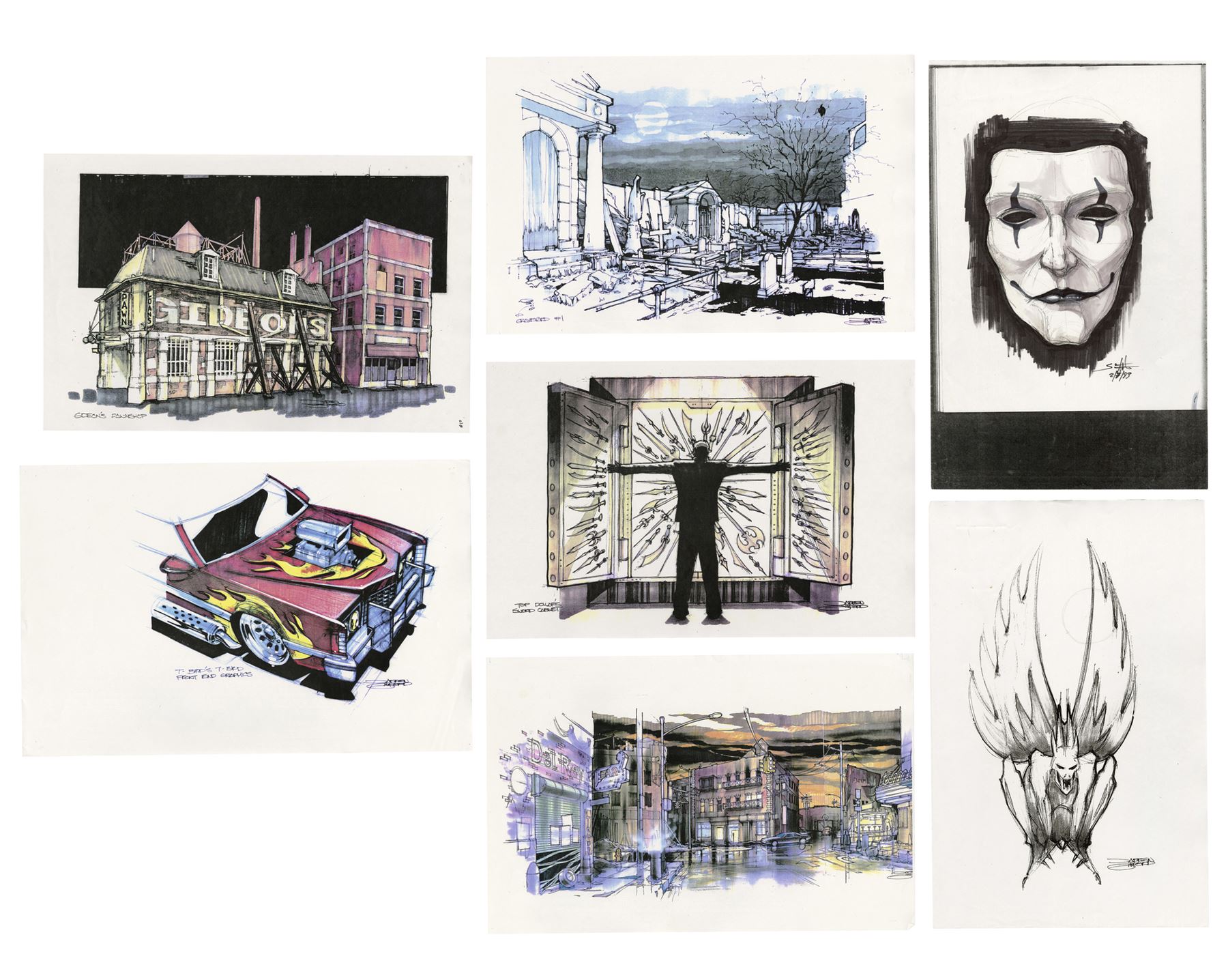 THE CROW (1994) - Hand-Drawn Sketches and Concept Art Prints - Hand-drawn sketches and concept art prints from Alex Proyas' The Crow. Concept art was created for various key sets, including Eric Draven's (Brandon Lee) apartment, the pit, alleyways, Gideon's (Jon Polito) pawn shop, and the church where Sarah (Rochelle Davis) was held hostage, then distributed to key departments to help create Proyas' dark depiction of Detroit.
