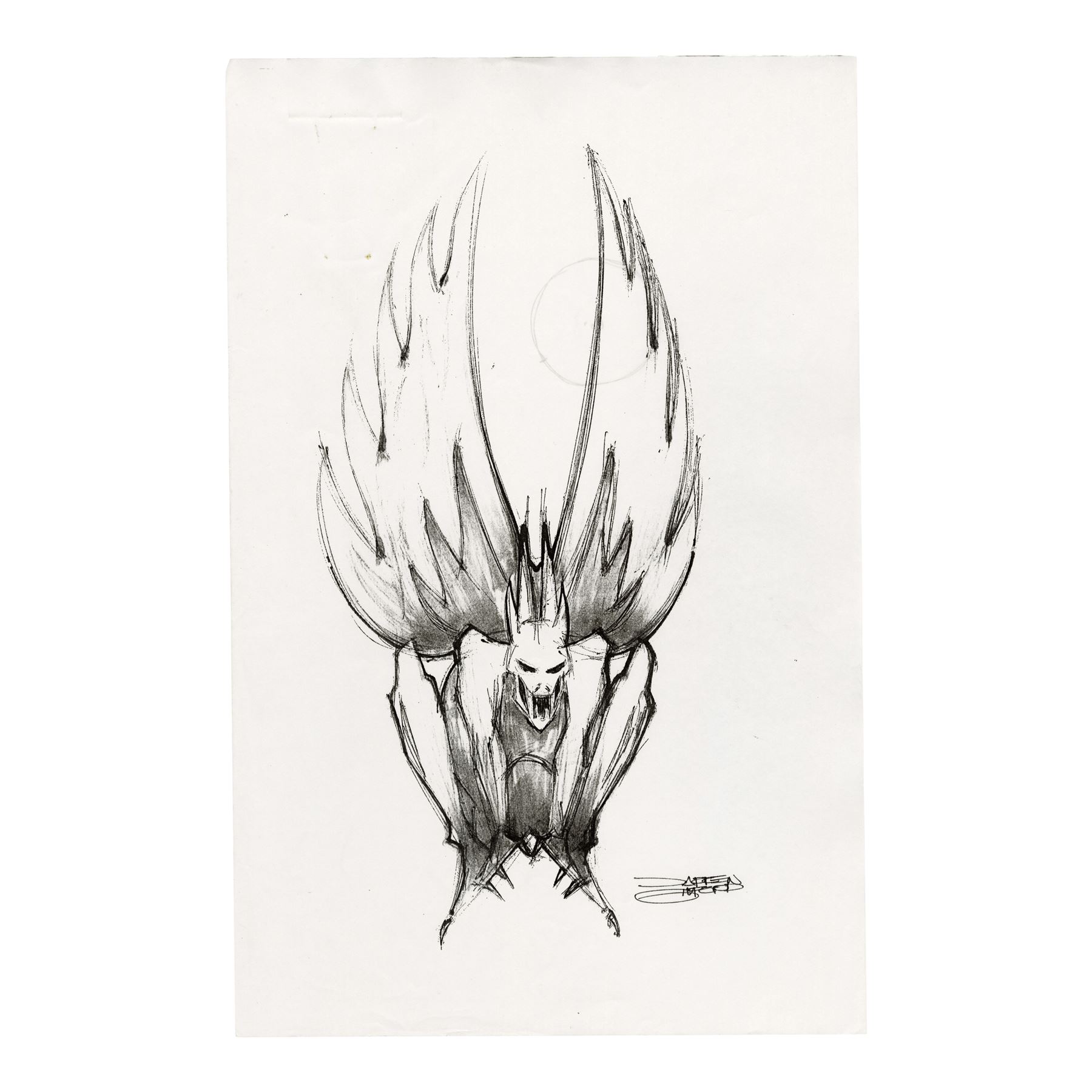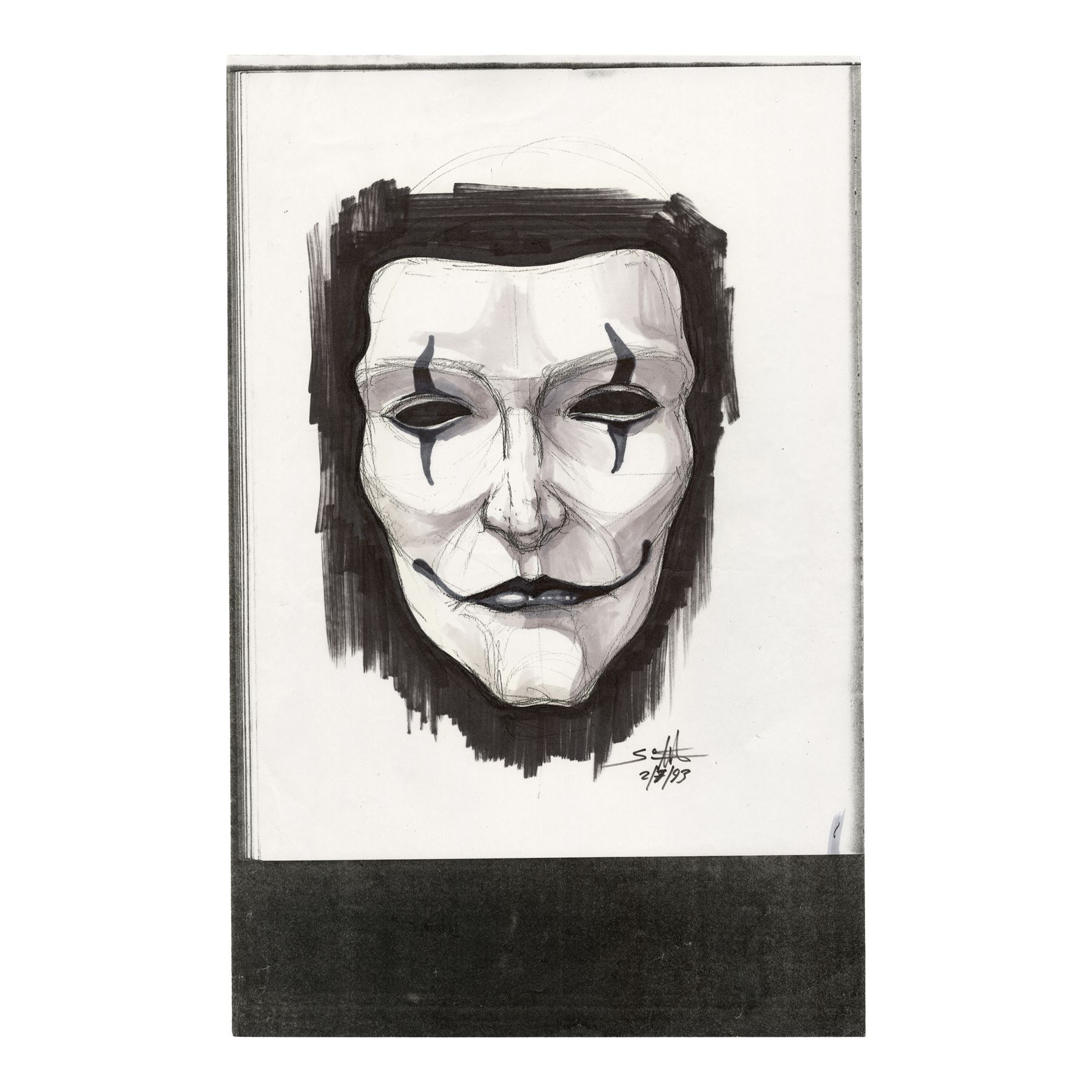 Created by illustrator Darren Gilford, art director Simon Murton, and illustrator Peter Pound, this lot consists of 106 concept designs printed in black-and-white and color featuring the printed signatures of the artists. Three are created and signed by Murton featuring a hand-drawn sketch of the knife rendered in graphite on tracing paper and two printed images of a mask with hand-illustrated details. This lot exhibits discoloration, folded corners, and pinholes from production use. Dimensions: (largest) 11" x 17" (28 cm x 43.25 cm)