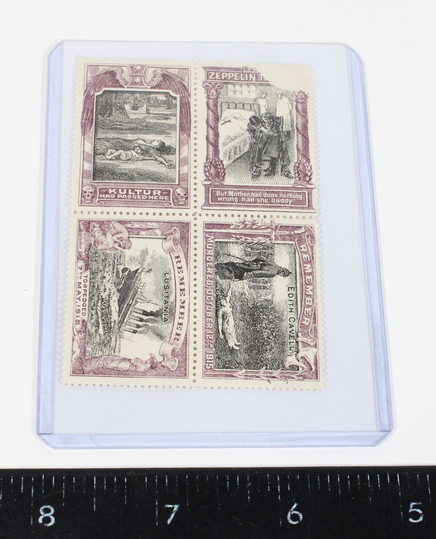 Lot of 4 stamps., Depicting German Autrocities, Sinking of Lusitania Torpedoed May 7th 1915, Hun "Kulture". Reverse of each uncut stamp marked "Published by WINOX LTD Richmond Surrey England" Homefront Propaganda