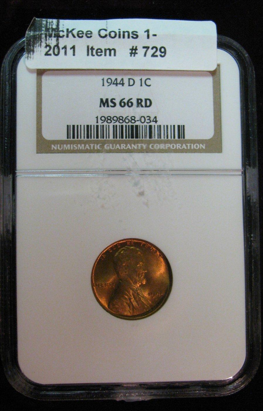 729. 1944 D Lincoln Cent. NGC slabbed MS 66 RD.