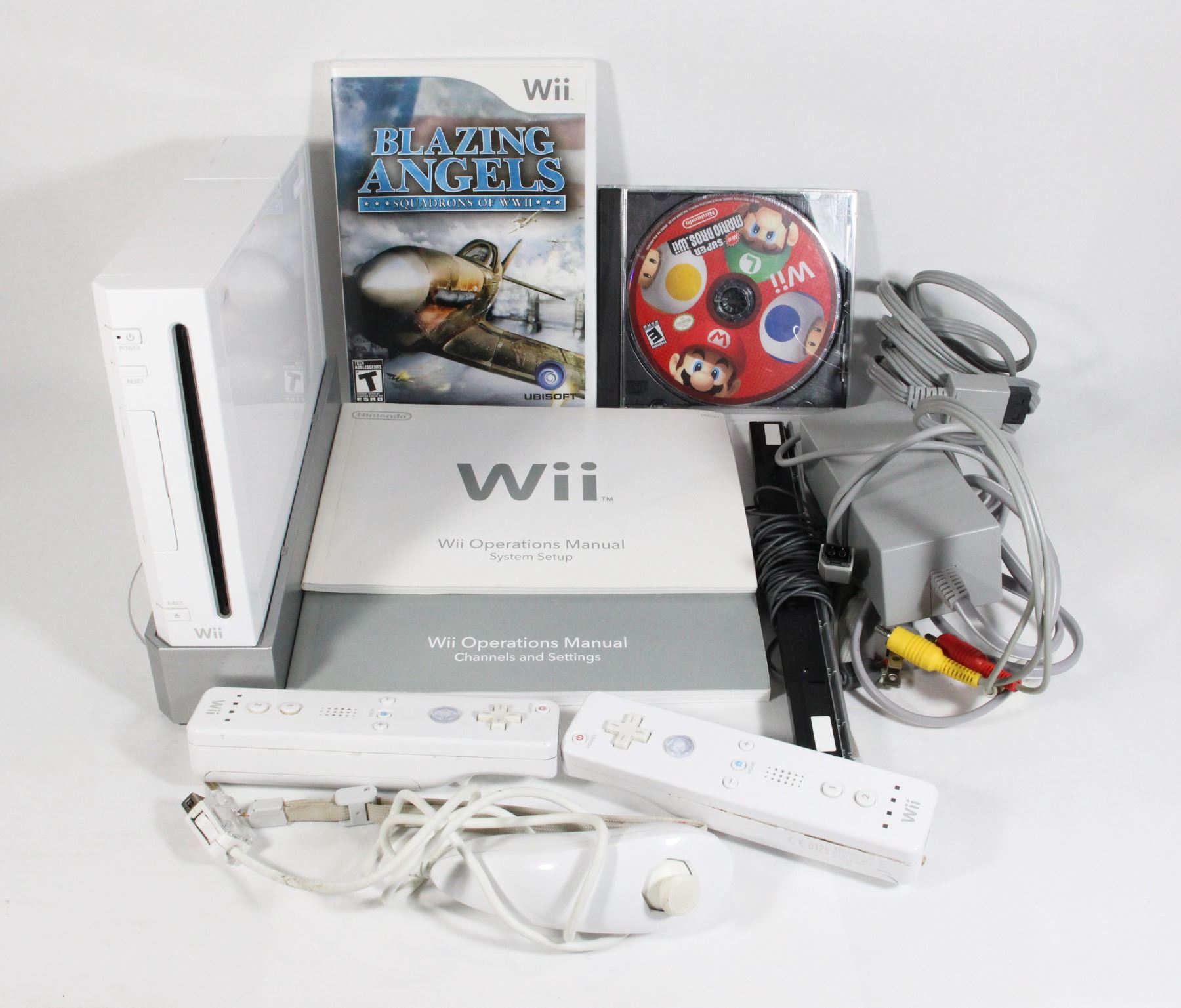 INCLUDES NEW SUPER MARIO BROS WII AND BLAZING ANGELS SQUADRONS OF WWII NINTENDO WII SYSTEM INCLUDES ALL CORDS STAND ETC